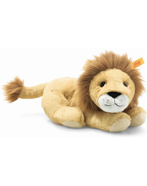 Als König des Dschungels präsentiert sich der 26 cm große Soft Cuddly Friends Liam Löwe aus kuschelweichem, goldblondem Plüsch! Seine Mähne ist sorgfältig zurechtgeschnitten und gebürstet, nur die Ohrfahne mit „Knopf im Ohr“ verrät die Löwenohren. Er besitzt glänzende schwarze Augen, ein verschmitztes Grinsen im weiß abgesetzten Gesicht. Nase und Mund sind in Schwarz gestickt, die großen Löwenpfoten in Hellbeige gearbeitet. Granulat sorgt für gemütliches Liegen und zusätzlichen Spielspaß.
