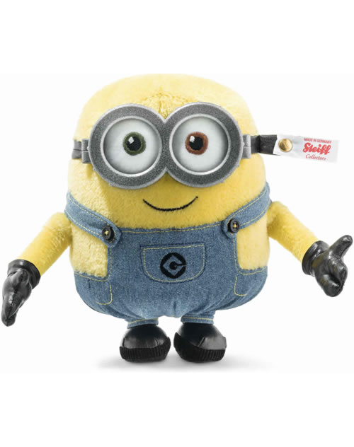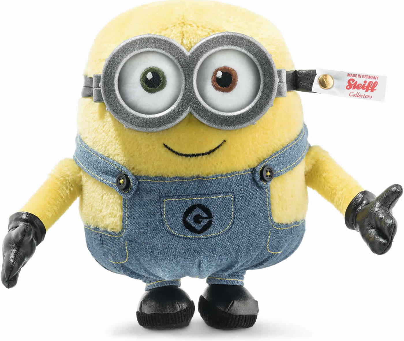 Die Steiff Minions sind auf dem Weg! MINIONS Die schelmischen, gelben Minions bilden Gru's nicht ganz so helle Boxencrew. Sie lassen sich leicht ablenken und können unberechenbar, neugierig und subversiv süß sein. Die hart arbeitenden und ihrem Anführer und seinen verrückten Heldentaten ergebenen Minions begnügen sich damit, als seine Crash-Test-Dummys zu dienen und jede Banane in Sichtweite zu essen. Bob ist aus hochwertigem Mohair gefertigt und trägt seinen kultigen Jeansanzug - und seine silberne Minion-Brille.