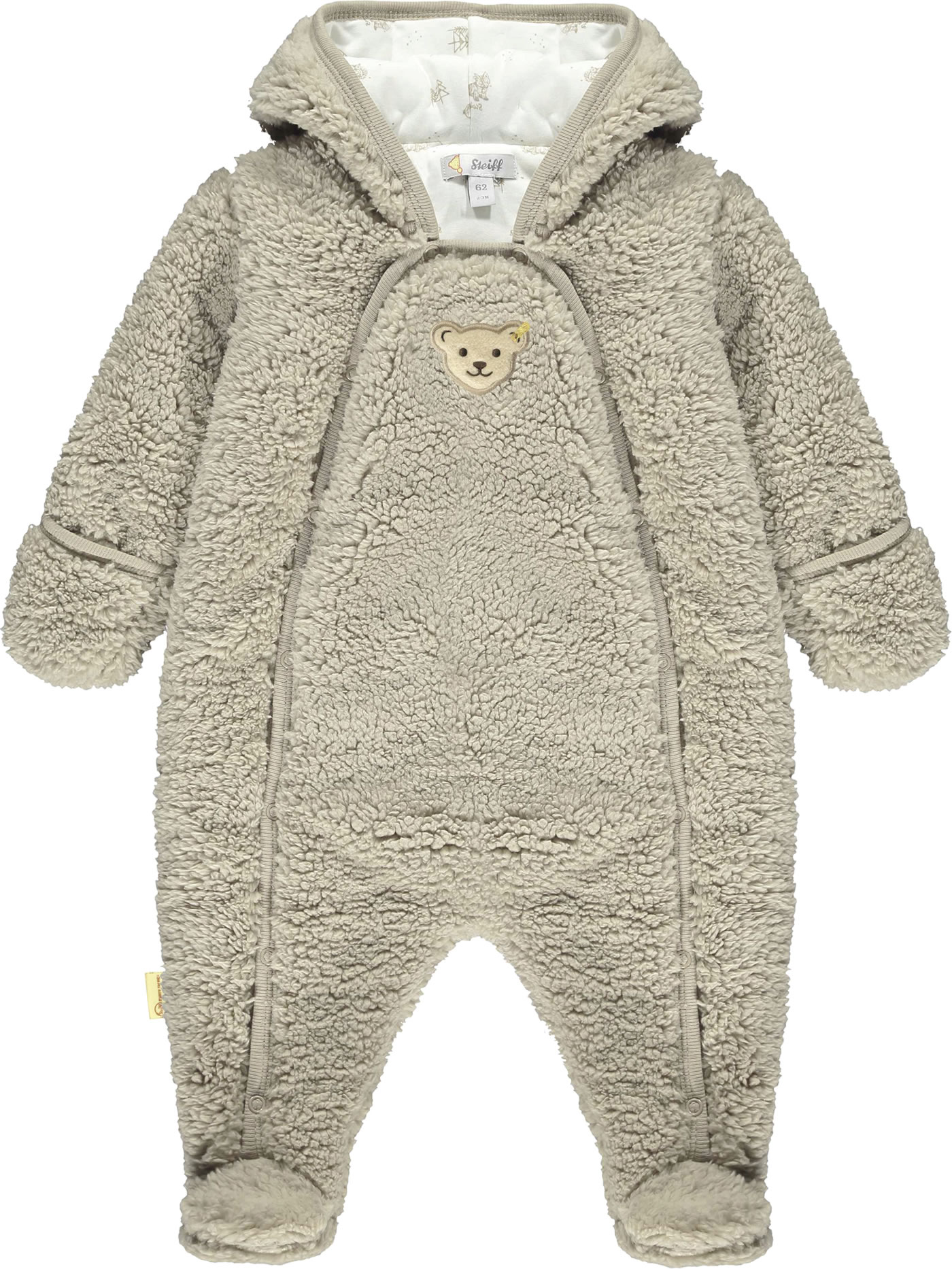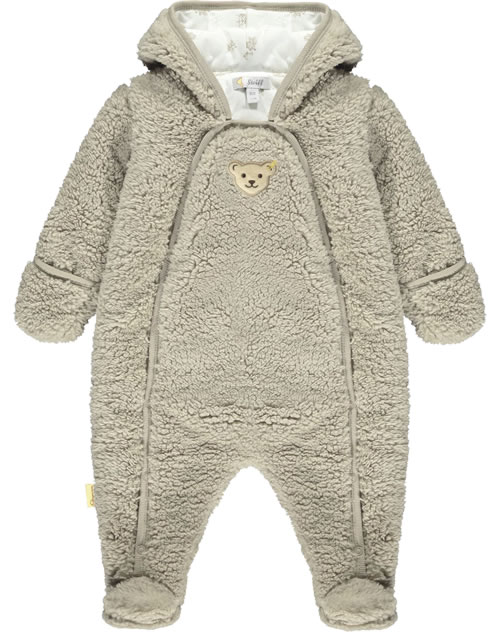 Der schöne Overall mit Füßen aus Teddyplüsch mit Kapuze aus der Forest Friends-Kollektion von STEIFF ist ein toller Begleiter für die kalten Tage. Außen ist er kuschelweich und innen ist der Overall mit einem weichen Baumwoll-Jersey gefüttert. Mit einer extralangen Druckknopfleiste, die vom rechten Fuß, über die Brust und bis zum linken Fuß geht, ist das An- und Ausziehen ein Kinderspiel. Die Ärmelenden lassen sich umkrempeln und ersetzen an kalten Tagen die Handschuhe. Der kleine STEIFF-Bär mit Schleifchen auf der Brust ist ein echter Hingucker.