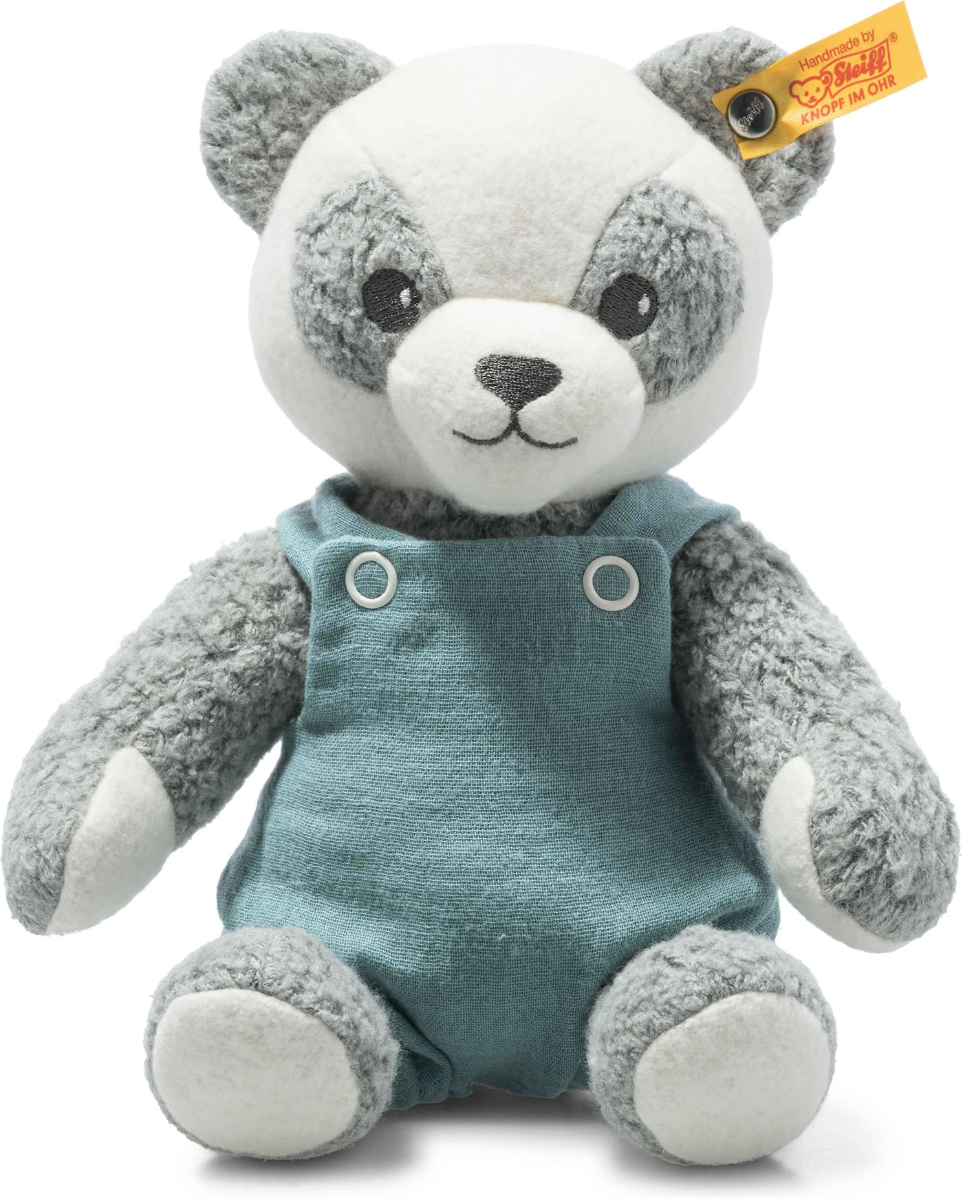 Der knuddelige Steiff GOTS Paco Panda in Grau-Weiß trägt eine schicke Trägerhose in Petrol. Er ist umweltbewusst mit Bio-Baumwolle und recycelten PET-Flaschen befüllt, sein Plüsch und der Hosenstoff sind aus flauschiger, zertifizierter 100% Bio-Baumwolle (GOTS). Der 26 cm große Paco ist mal weiß und fein, dann wieder grau und wuschelig, Augen und Nase sind gestickt. So fühlt er sich immer wieder unterschiedlich an.