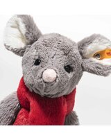 Mit ihrem weichen grauen Plüsch, den flauschigen Öhrchen und den weißen Pfötchen sitzt die 21 cm große Maus gemütlich und verzaubert mit einem sanften, liebevollen Blick.