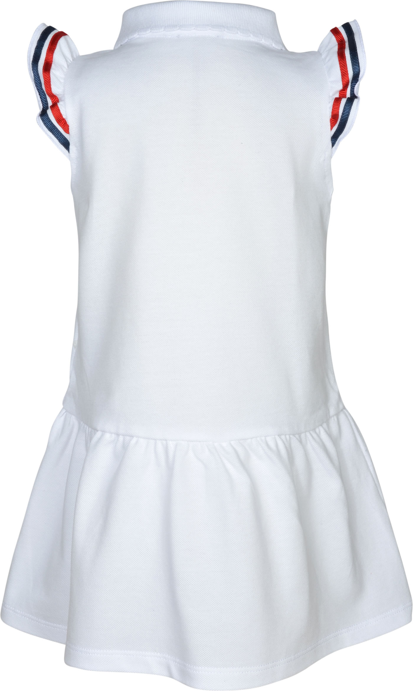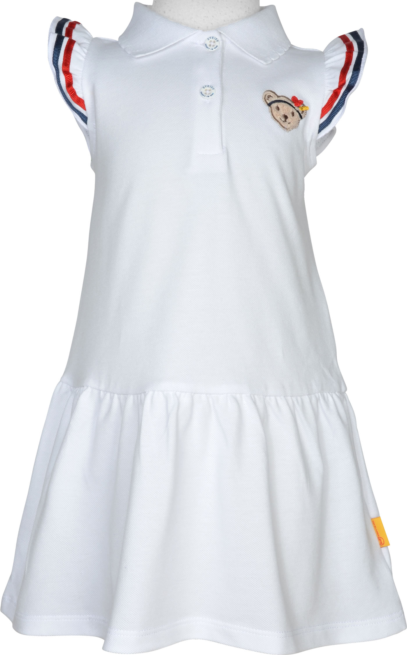 Polo-Kleid von STEIFF aus der Marine Air Kollektion. Das Polo-Keid im Matrosenstil ist aus Polo-Piqué und auch die Knopfleiste ist im Stil eines klassischen Polo-Shirts gehalten. Besondere Details sind der STEIFF Bär auf der Brust und die gestreiften Rüschen. Das Gummibündchen am Rock sorgt für einen perfekten Sitz.