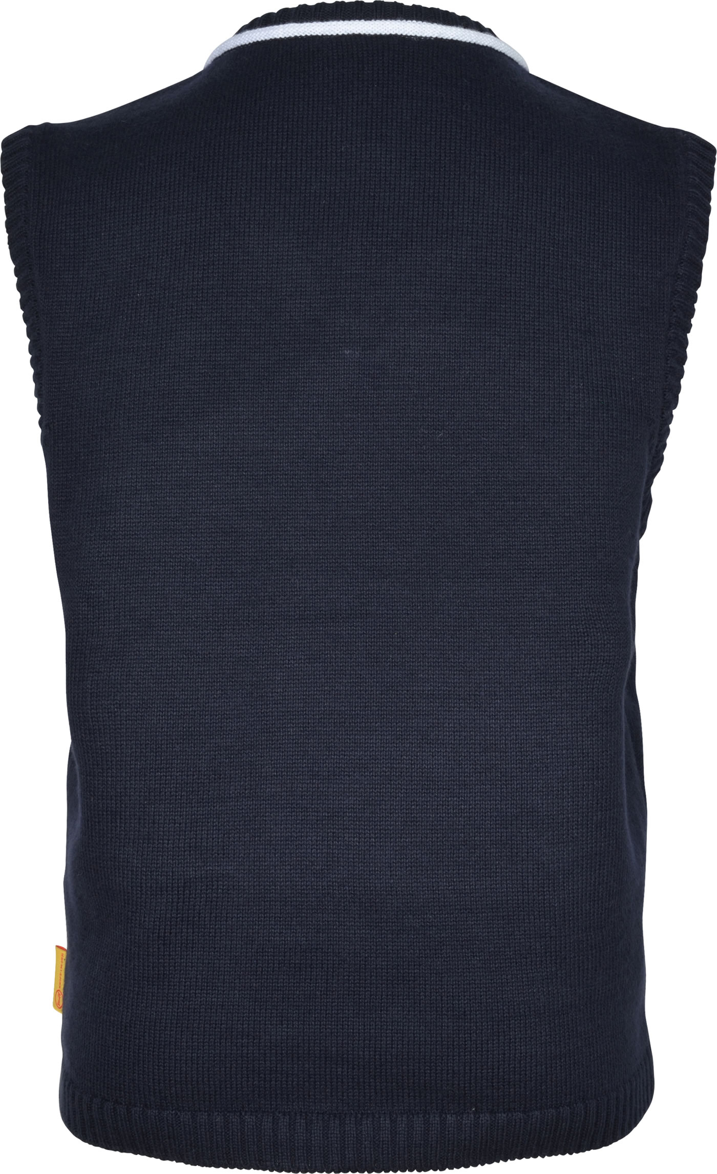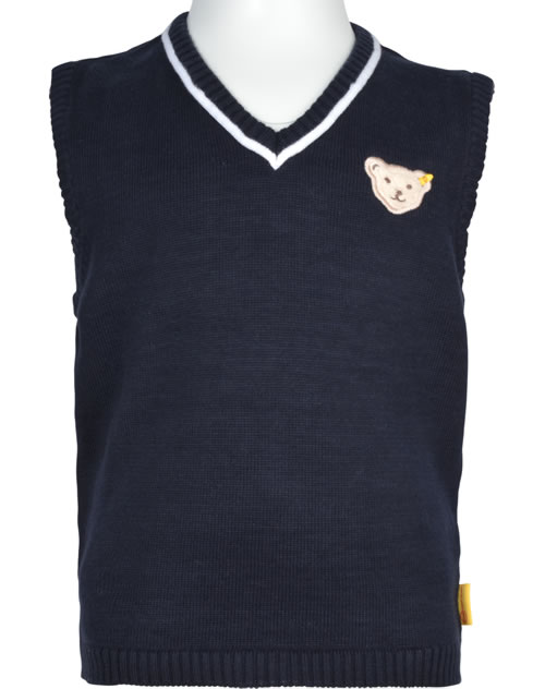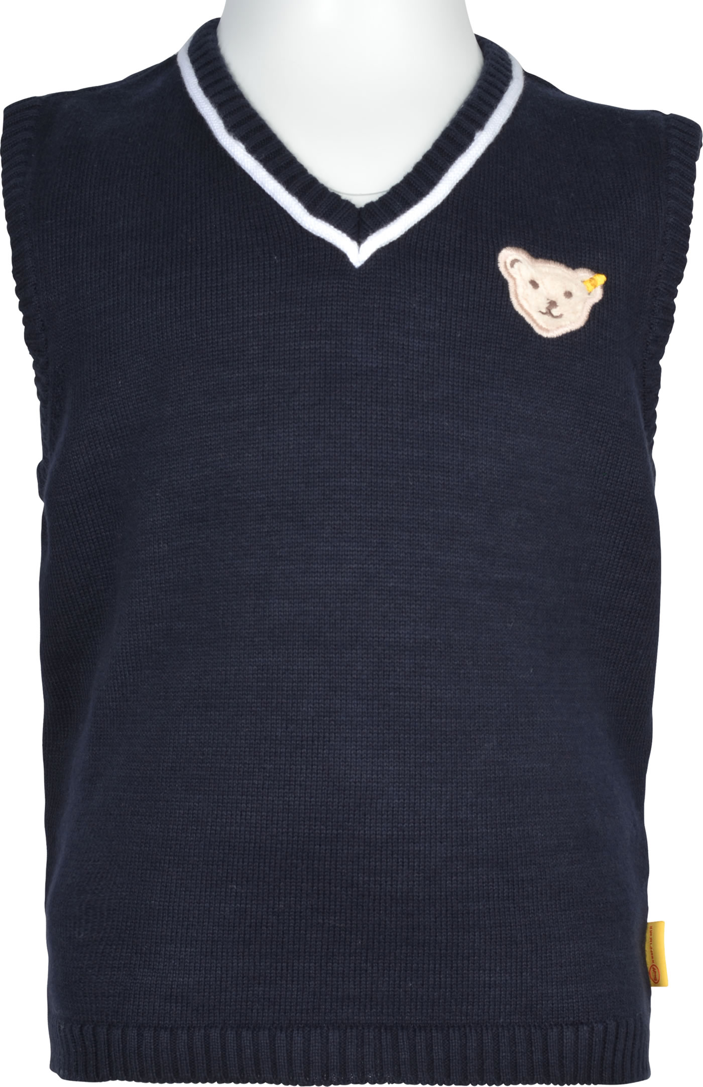 Hübscher Pullunder in dunkelblau für Jungen von STEIFF aus der Special Day-Kollektion. Die gerippten Bündchen am Halsausschnitt, den Ärmeln und am Saum machen den Pullunder zu einem tollen Hingucker. Die linke Brust ziert der flauschige STEIFF Bär. Ob mit Hemd oder T-Shirt kombiniert - mit diesem Lieblingsstück trifft man immer eine gute Wahl.