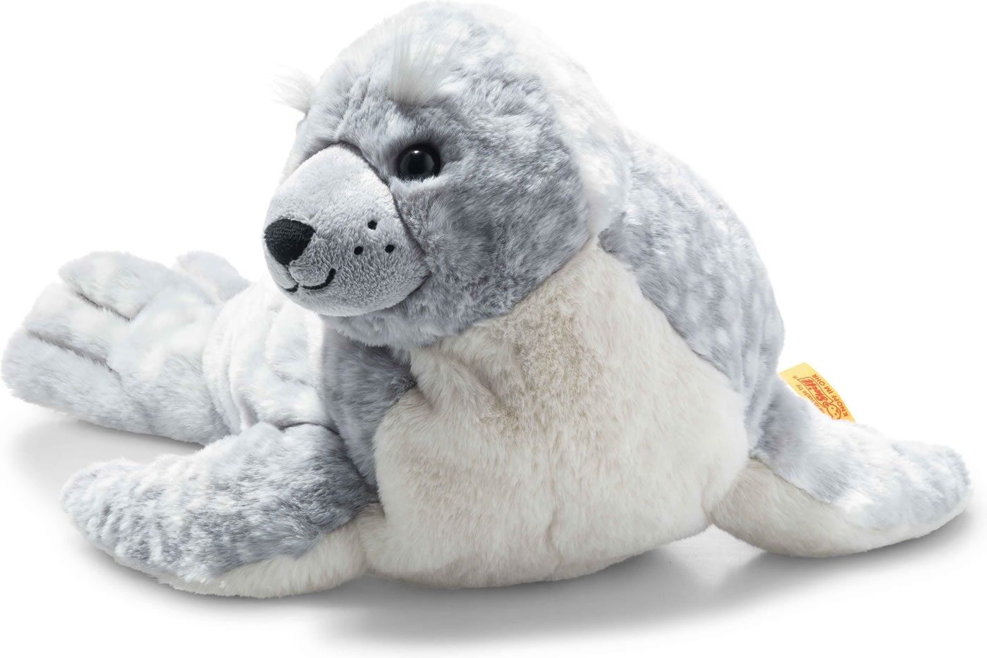 Die 40 cm große Soft Cuddly Friends Aila Robbe trägt eisblauen, kuschelweichen, mit bedrucktem Plüsch, dazu leuchtendes Weiß auf Brust und Flossenunterseiten. Schwarze Nase und Mund sind gestickt, seitliche Punkte auf ihrer kurzflorigen Schnauze deuten die Barthaare an. Die schwarzen Augen sind mit weißen Brauenpinseln dekoriert. Alia Robbe ist weich gestopft. Granulatsäckchen in Seitenflossen und unterem Bauchbereich halten sie stabil. Starke, naturgetreu gearbeitete Schwanzflossen leiten sie durchs Wasser.