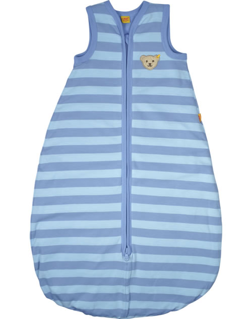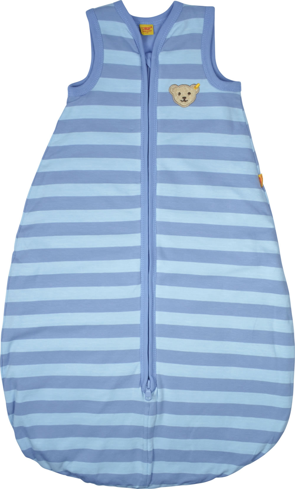 Der ideale Begleiter für das Baby - kuschelig weicher Schlafsack von STEIFF aus der Summer Colors-Kollektion. Der gestreifte Jersey-Schlafsack wird schnell zu einem Lieblingsstück. Die Innenseite ist mit einem Futter in blau versehen. Die linke Seite der Brust ziert der kleine STEIFF Bär. Der Reißverschluss ist am Hals mit einem Kinnschutz versehen.