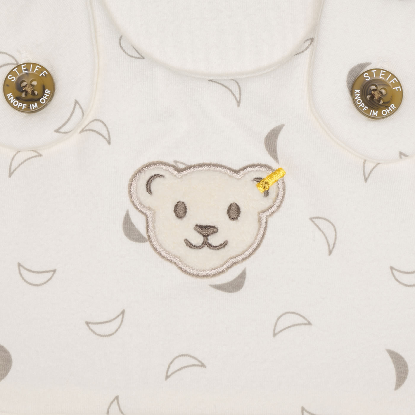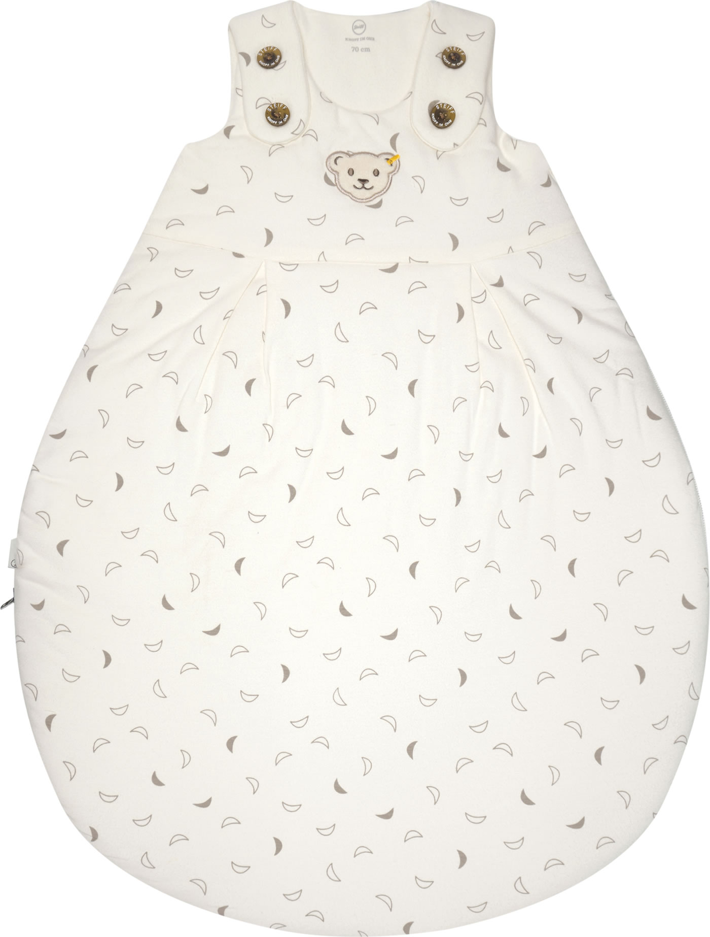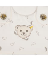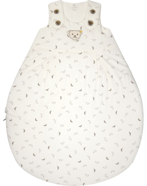 Der ideale Begleiter für das Baby - kuschelig weicher Schlafsack aus der Baby Organic Half Moon Kollektion von STEIFF. Der Schlafsack mit den hübschen Monden wird schnell zu einem Lieblingsstück. Die Innenseite ist mit weißem Futter ausgestattet. Die Brust ziert der kleine STEIFF Bär. Knöpfe auf der Schulter und ein umlaufender Reißverschluss, der sich ganz öffnen läßt, erleichtern das An- und Ausziehen. Der birnenförmige Schlafsack ist schön breit und bietet dadurch viel Strampelfreiheit.