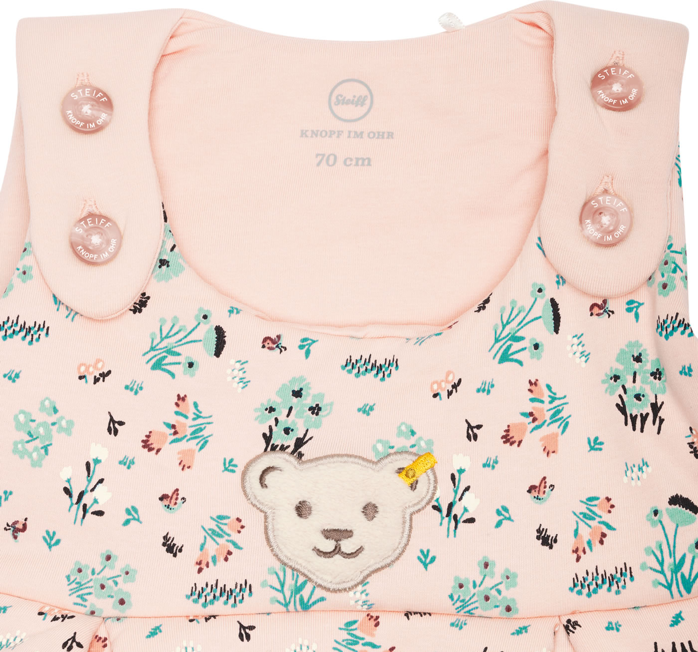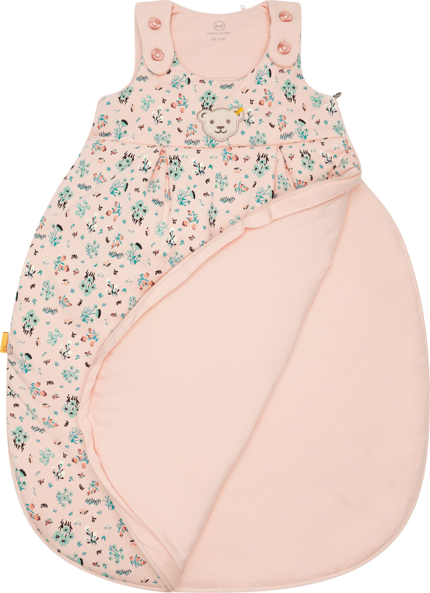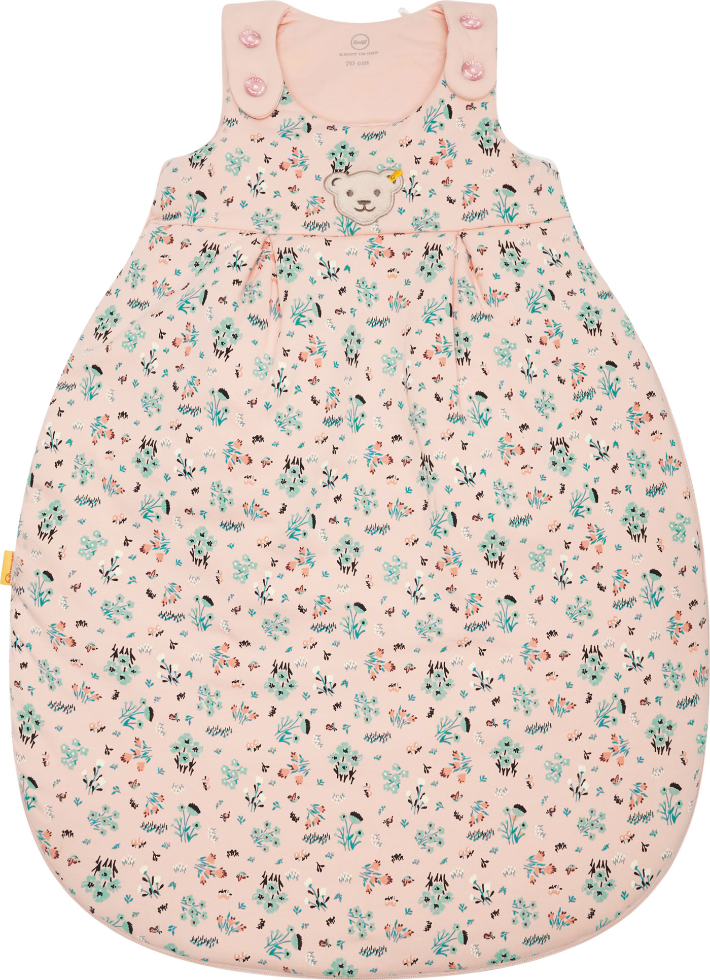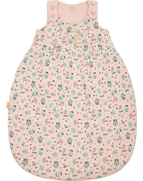 Der ideale Begleiter für das Baby - kuschelig weicher Schlafsack für Mädchen aus der Bird's Twittering-Kollektion von STEIFF. Der geblümte Schlafsack wird schnell zu einem Lieblingsstück. Die Brust ziert der kleine STEIFF Bär. Knöpfe auf der Schulter und ein umlaufender Reißverschluss, der sich ganz öffnen läßt, erleichtern das An- und Ausziehen. Der birnenförmige Schlafsack ist schön breit und bietet dadurch viel Strampelfreiheit.