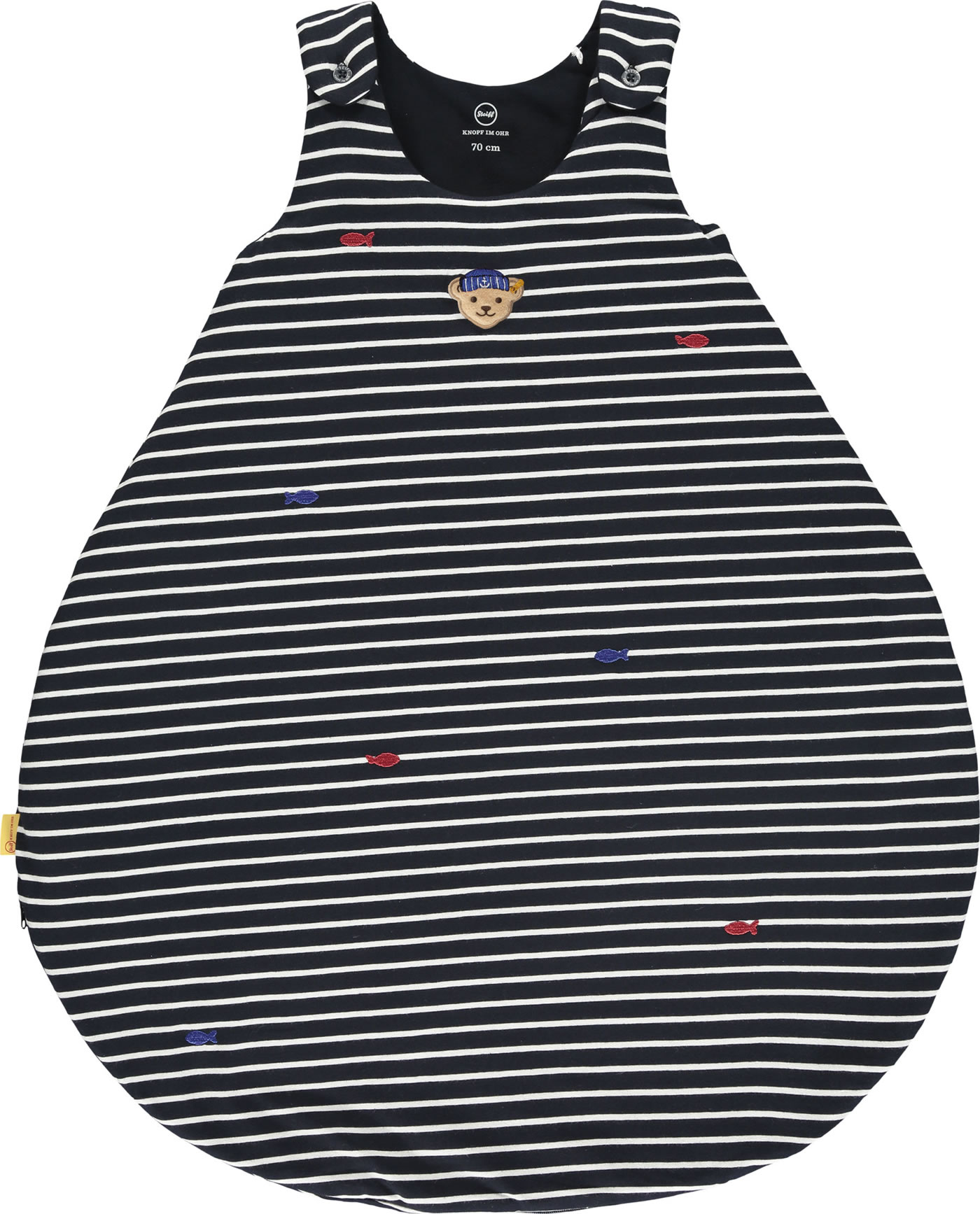 Der ideale Begleiter für das Baby - kuschelig weicher Schlafsack für Jungen aus der Fish & Ship-Kollektion von STEIFF. Der gestreifte Schlafsack wird schnell zu einem Lieblingsstück. Die Innenseite ist mit blauem Futter ausgestattet. Die Brust ziert der kleine STEIFF Bär mit Matrosenmütze. Knöpfe auf der Schulter und ein umlaufender Reißverschluss, der sich ganz öffnen läßt, erleichtern das An- und Ausziehen. Der birnenförmige Schlafsack ist schön breit und bietet dadurch viel Strampelfreiheit.