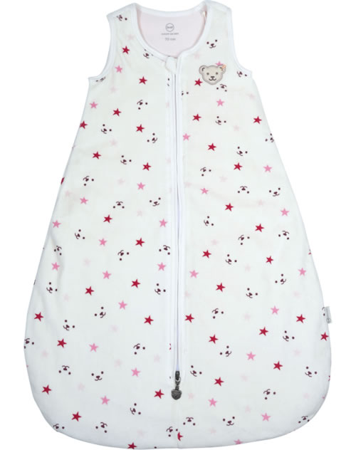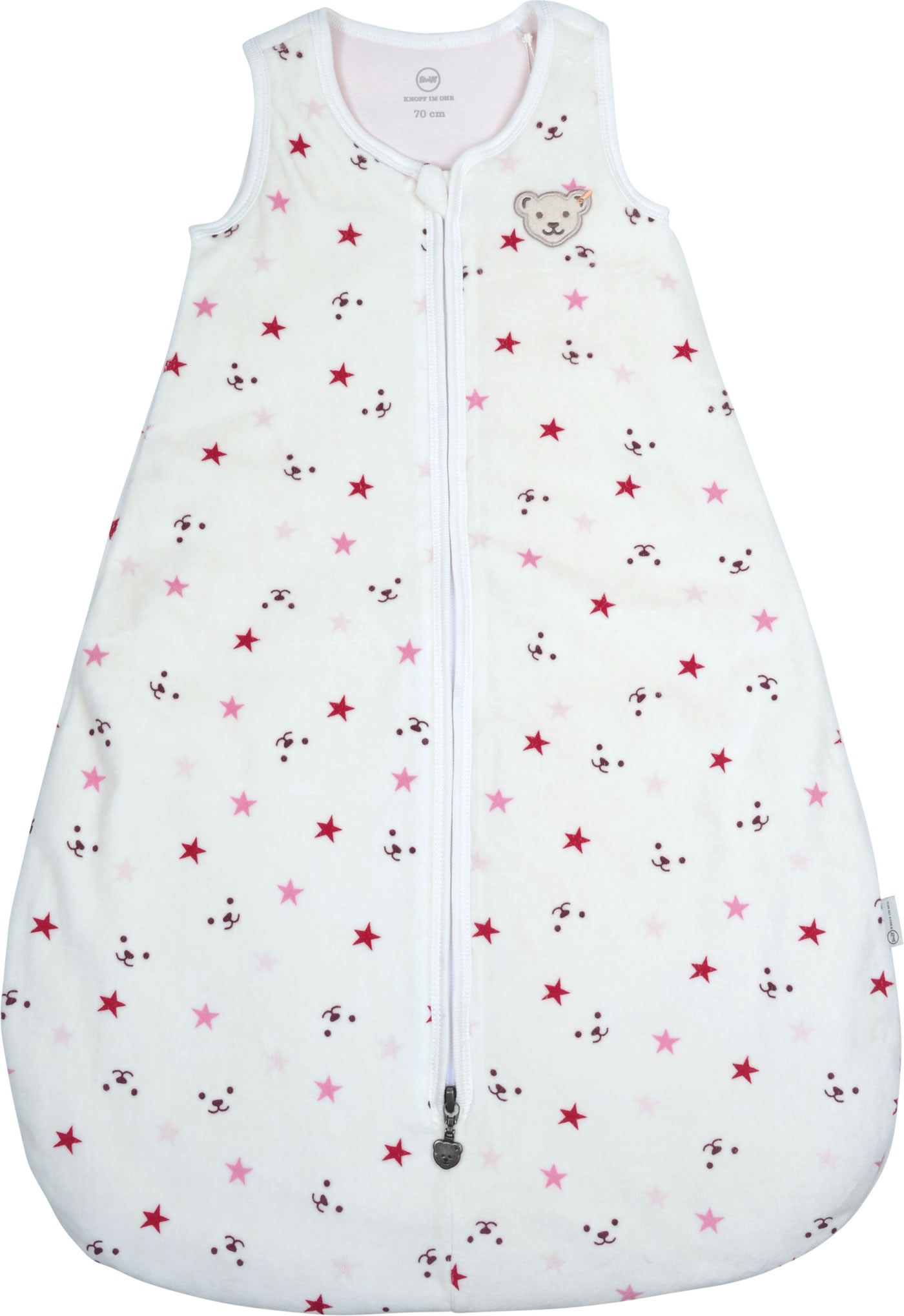 Der ideale Begleiter für das Baby - kuschelig weicher Nicki-Schlafsack für Mädchen aus der Wellness-Kollektion von STEIFF. Der cremeweiße Schlafsack wird schnell zu einem Lieblingsstück. Die Innenseite ist hellrosa gefüttert. Die linke Brust ziert der kleine STEIFF Bär. Der Reißverschluss ist am Hals mit einem Kinnschutz versehen.