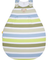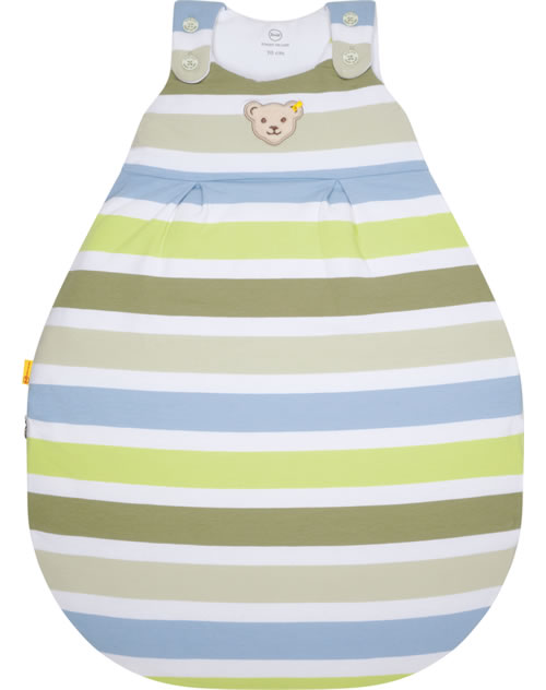 Der ideale Begleiter für das Baby - kuschelig weicher Schlafsack für Jungen aus der Roarsome-Kollektion von STEIFF. Der gestreifte Schlafsack wird schnell zu einem Lieblingsstück. Die Innenseite ist mit weißem Futter ausgestattet. Die Brust ziert der kleine STEIFF Bär. Knöpfe auf der Schulter und ein umlaufender Reißverschluss, der sich ganz öffnen läßt, erleichtern das An- und Ausziehen. Der birnenförmige Schlafsack ist schön breit und bietet dadurch viel Strampelfreiheit.