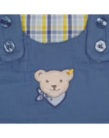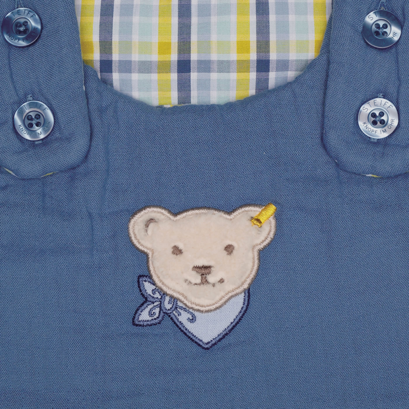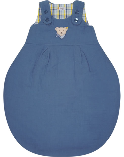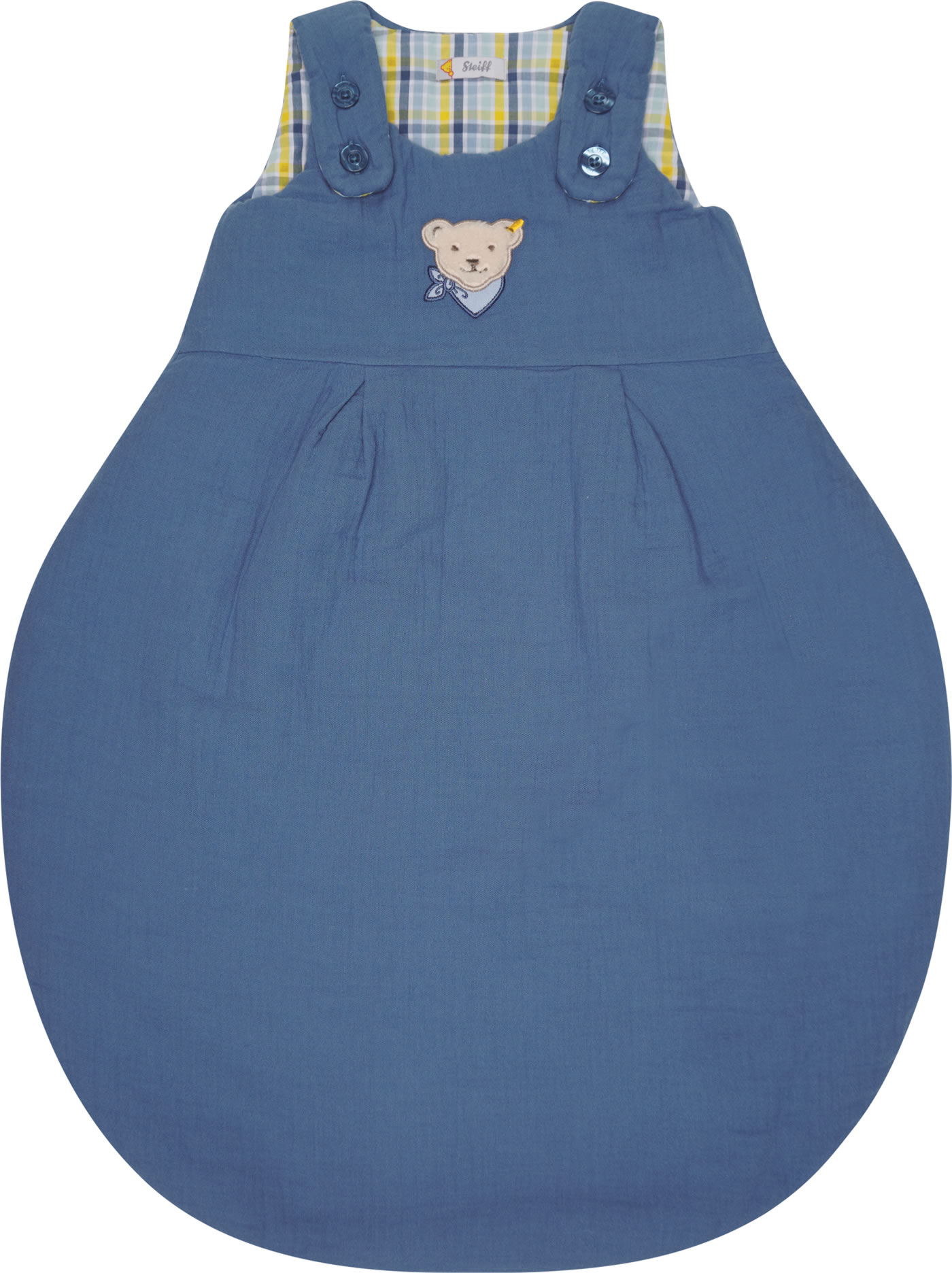 Der ideale Begleiter für das Baby - kuschelig weicher Schlafsack für Jungen aus der Elephant Ride-Kollektion von STEIFF. Der Schlafsack wird schnell zu einem Lieblingsstück. Die Innenseite ist mit bunt kariertem Futter ausgestattet. Die Brust ziert der kleine STEIFF Bär mit Halstuch. Knöpfe auf der Schulter und ein umlaufender Reißverschluss, der sich ganz öffnen läßt, erleichtern das An- und Ausziehen. Der birnenförmige Schlafsack aus Seersucker-Material ist schön breit und bietet dadurch viel Strampelfreiheit.