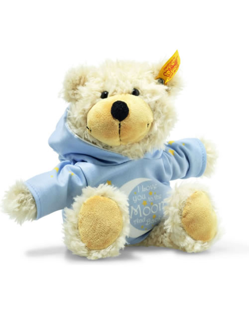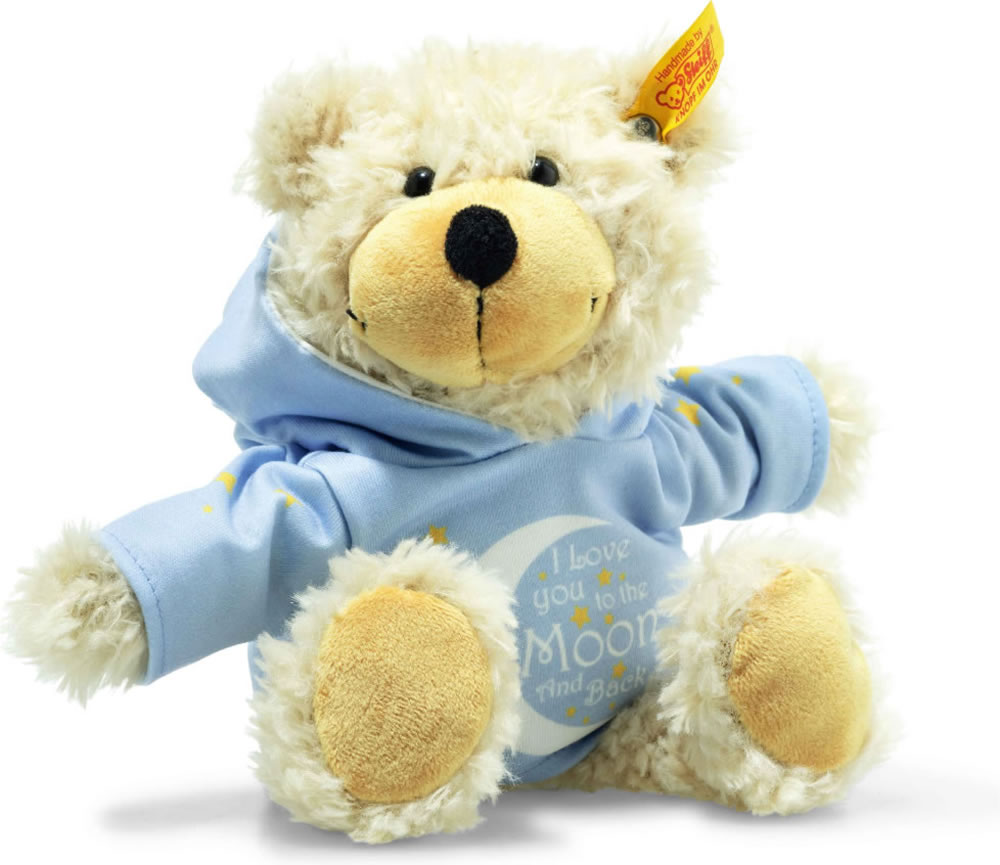 Charly ist 23 cm groß und aus besonders weichem Plüsch. Sein beigefarbenes Fell ist gelockt und er hat eine schwarze lustige Nase. Die Fußsohlen sind caramell. Sitzen kann der süße Charly gut dank der im Gesäß eingearbeiteten Granulatsäckchen. Der Pullover ist ausziehbar. Vorne steht aufgedruckt „I love you to the moon and back“, umrahmt von einem weißen Halbmond. Verschieden große gelbe Sterne machen das Dekor vollkommen. Die Ärmel sind ebenfalls mit gelben Sternen bedruckt. In der Kapuze sind Öffnungen, um die Teddybärenohren durchzustecken.