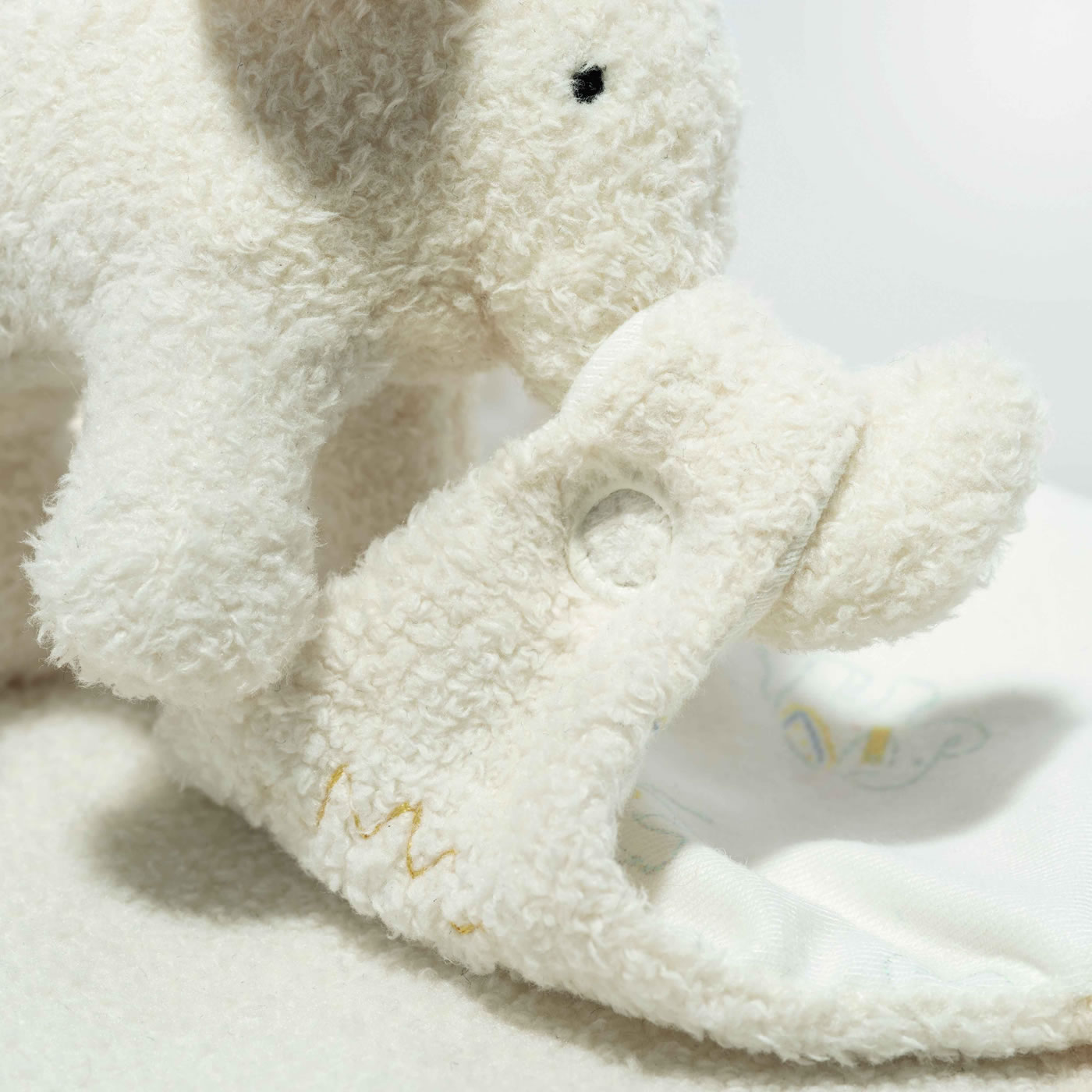 Als doppelt sanft erweist sich das 35 cm große Schmusetuch Elefäntle – durch Baumwolle auf der einen, kuscheligen Plüsch auf der anderen Seite. Die gestickte Steiff Elefantenfamilie inspiriert zu schönen Geschichten. Beim Zuhören entdecken Babys am liebsten das kuschelweiche Original-Elefäntle, das sich mittels einem Druckknopf vom Tuch trennen lässt. Es hat einen tollen Rüssel, gestickte Augen, schöne große Ohren mit Edelstahl „Knopf im Ohr“, einen weichen Körper und im Schwanz einen Knoten – nicht zu vergessen – die Rassel im Elefäntlebauch.