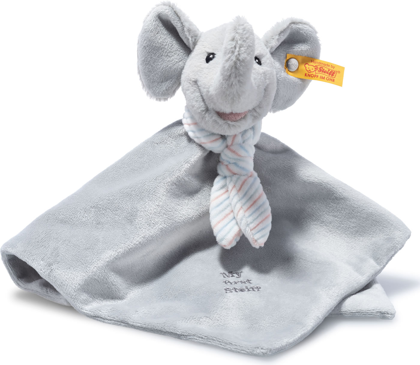 My First Steiff Ellie Elefant als Schmusetuch - besonders sanft zu zarter Babyhaut, absolut sicher verarbeitet und herrlich weich für anschmiegsames Kuscheln mit den Allerkleinsten. Ellie Elefant strahlt mit ihrem fröhlichen Lächeln und dem lieben Blick ganz viel Wärme aus, ihre großen Ohren und ihr Plüsch-Schleifchen um den Hals laden zum Festhalten und Fühlen ein und der kuschelige Plüsch sorgt bei jedem Hautkontakt für Wohlbefinden. Mit „My First Steiff“ Stickerei.