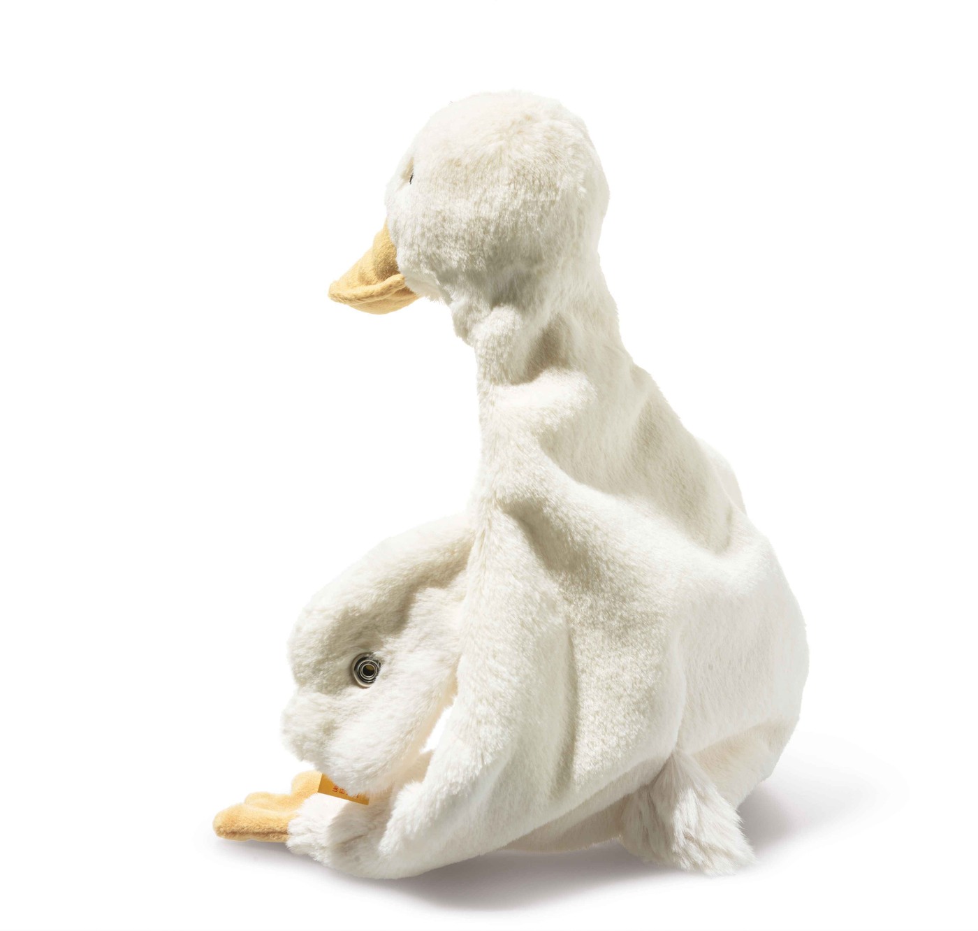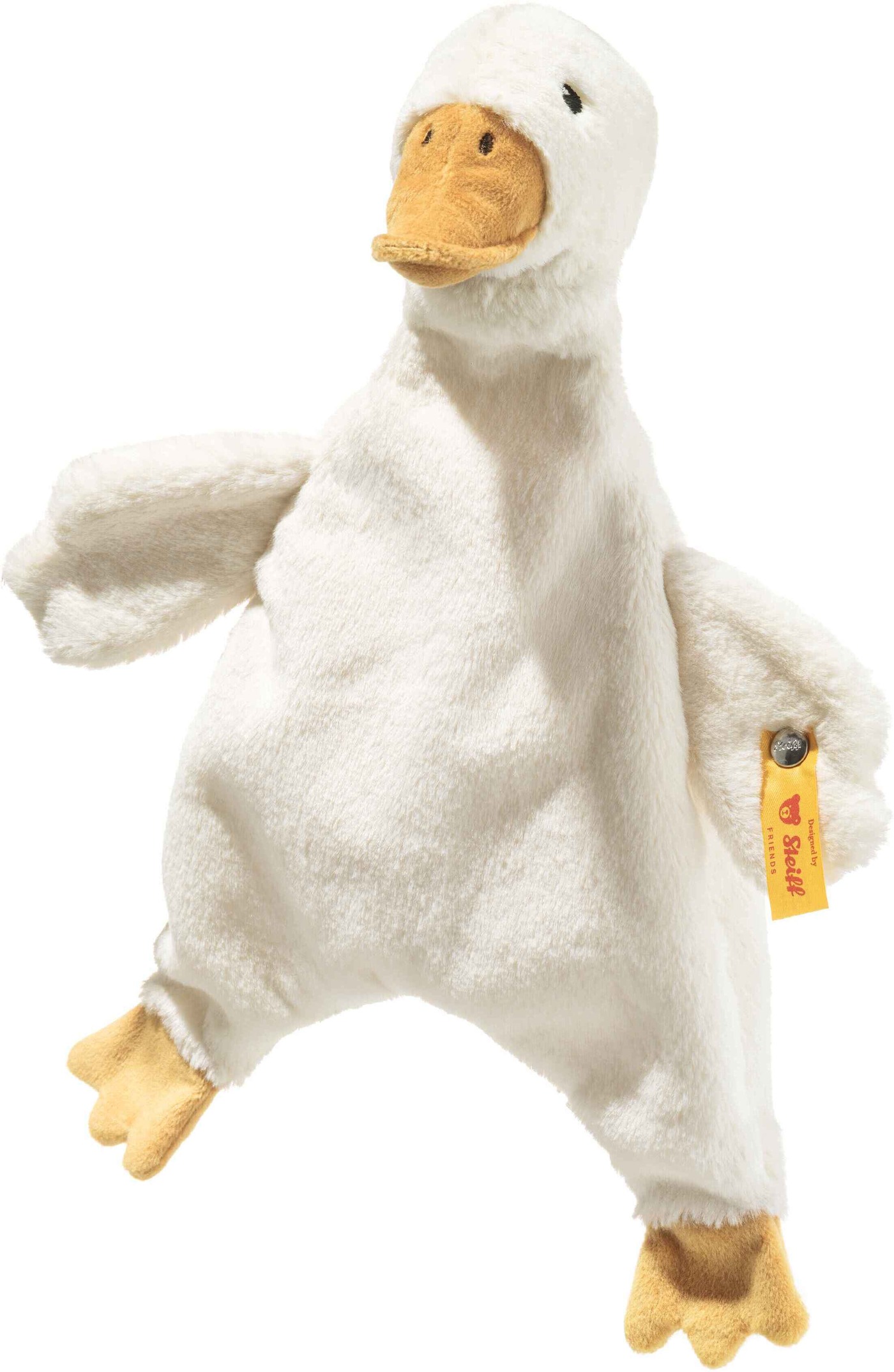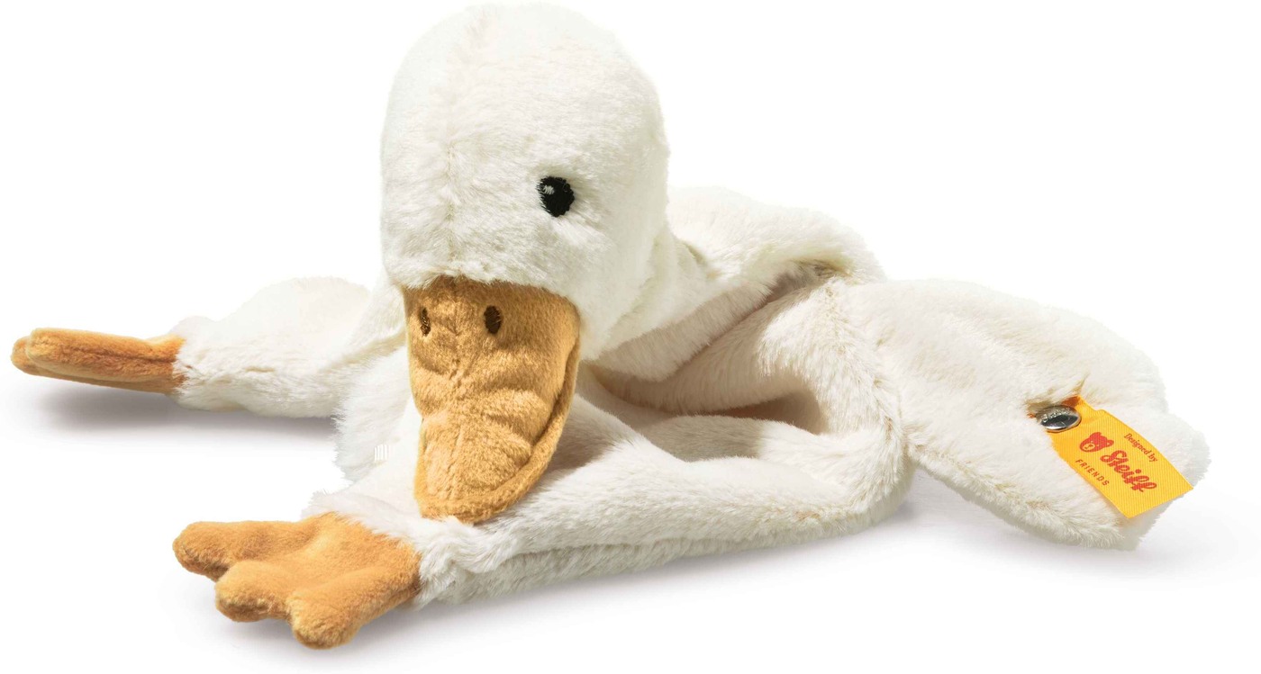 Der gelbe Schnabel und die kleinen Füßchen setzen freundliche Akzente und wecken spielerisch die Neugier.