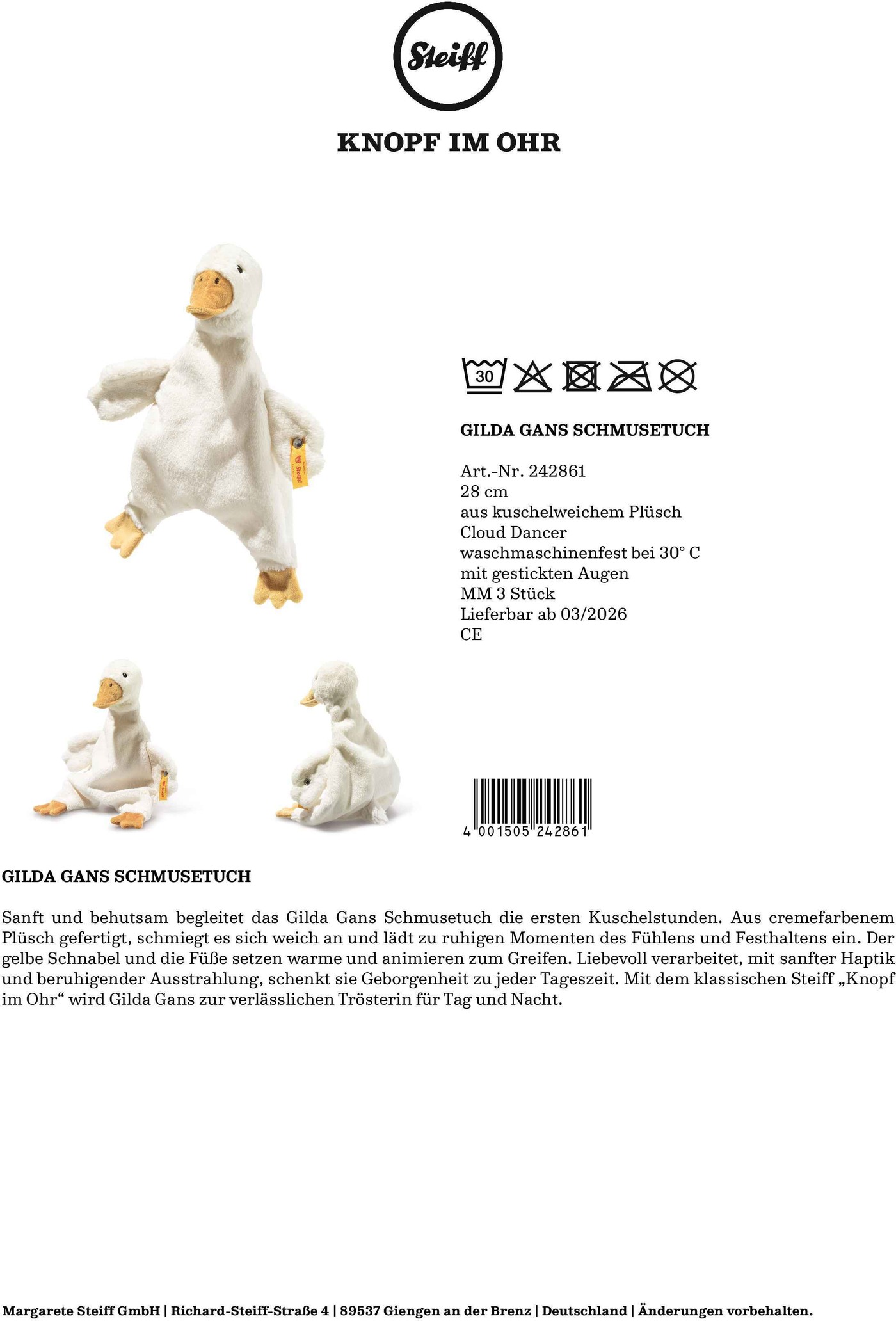 Der bekannte Steiff- „Knopf im Ohr“ steht dabei für geprüfte Qualität und macht das Schmusetuch zu einem besonderen Geschenk für die Kleinsten.