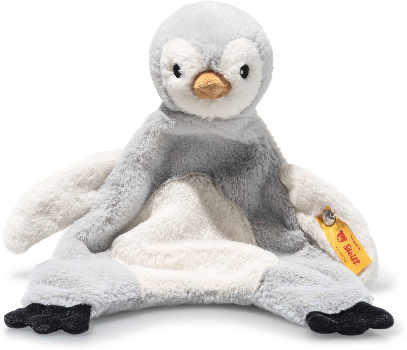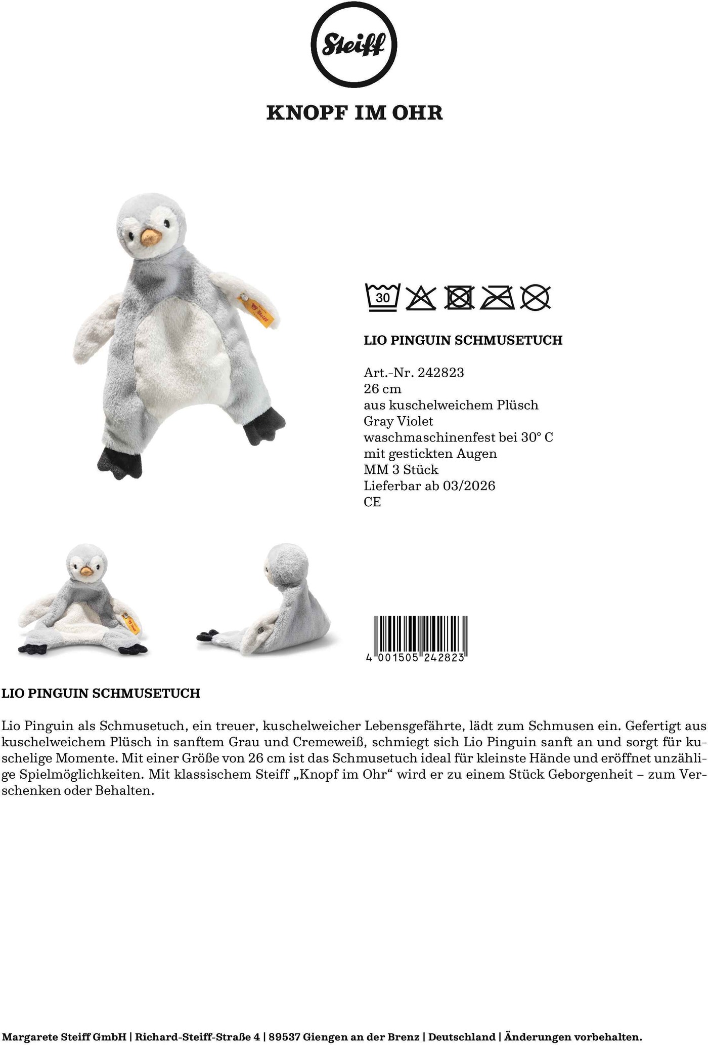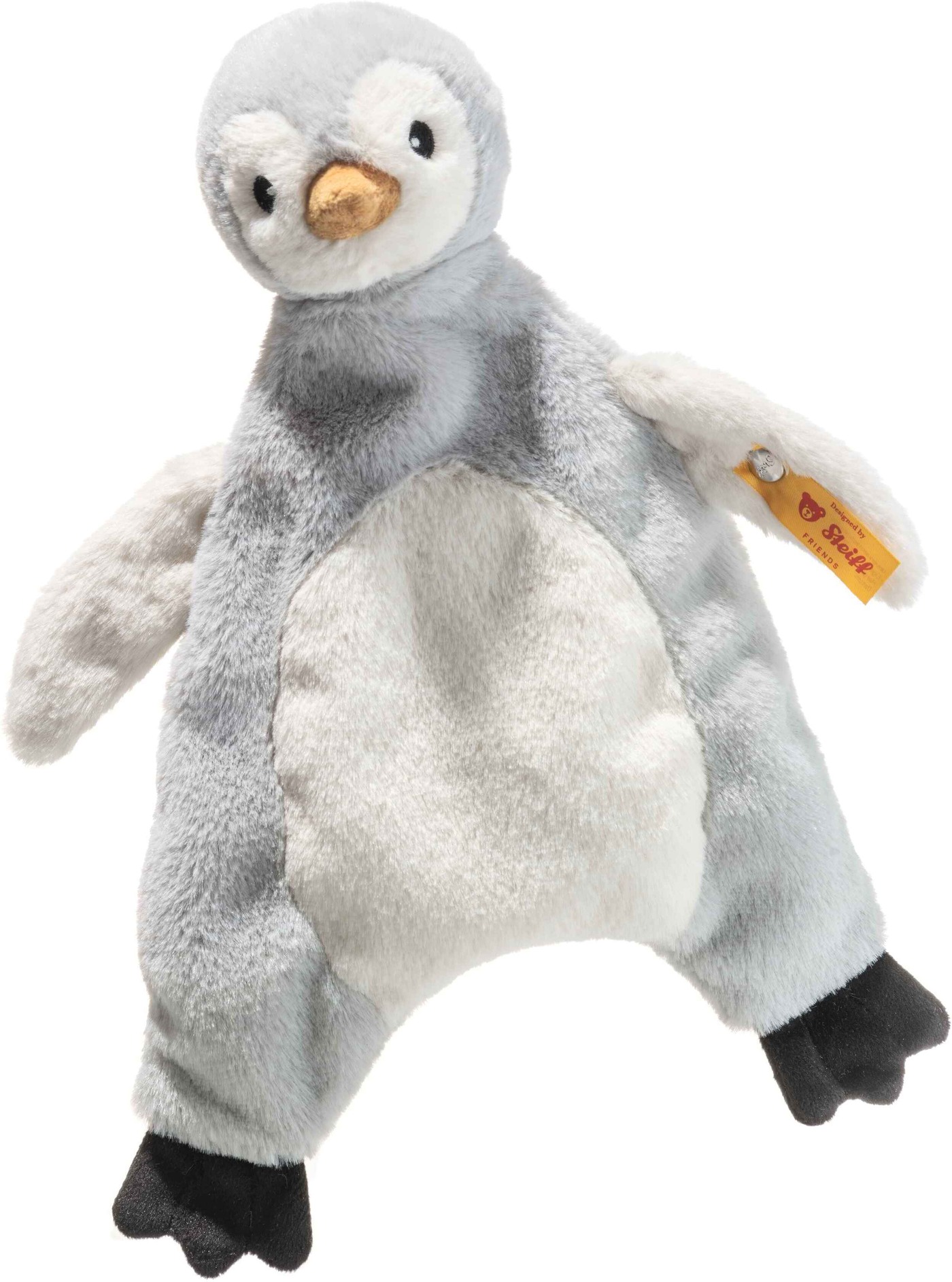 Der bekannte Steiff- „Knopf im Ohr“ steht dabei für höchste Qualität und macht den kleinen Pinguin zu einem ganz besonderen Geschenk zur Geburt oder für die erste Kuschelzeit.