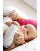 Alle Kuscheltiere aus der GOTS Serie sind aus kontrolliert biologisch angebauter Baumwolle gefertigt. Das GOTS Rosy Teddybär Schmusetuch ist 28 cm groß. Das weiche Schmusetuch aus Baumwolle ist auf der Vorderseite in den Farben Creme, Hellgrün, Rosa und Hellbraun gestreift. Die Rückseite sowie die Knoten an den Tuchenden sind Rosa. Ein Innenohr ist rosa, das andere in den Farben der Tuchvorderseite gestreift. Augen, Nase und Mund sind aufwendig in Braun gestickt.