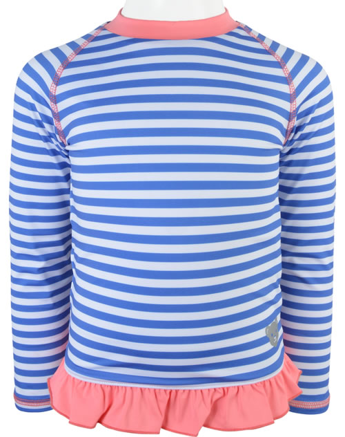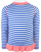 Schwimm-Shirt mit langen Ärmeln für Mädchen von STEIFF. Mit diesem Shirt läßt sich die Sonne sorgloser genießen und nach dem Baden ist es schnell wieder trocken. Schöne Details sind die Rüschenkante und der STEIFF Bär auf der Vorderseite. Der Reißverschluss befindet sich auf der Rückseite. Das Material bietet Sonnenschutz mit UPF 50+.
