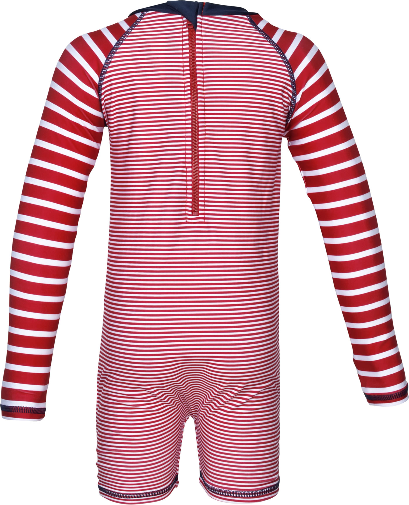 Dieser gestreifte Schwimmanzug von STEIFF schützt die Kleinen im Wasser und an Land vor schädlicher UV-Strahlung. Der Sonnenanzug hat einen Lichtschutzfaktor von 50+. Reißverschluss im Rücken. Hübsche Details sind das Herz-Motiv auf der Brust und der STEIFF Bär auf dem linken Bein.