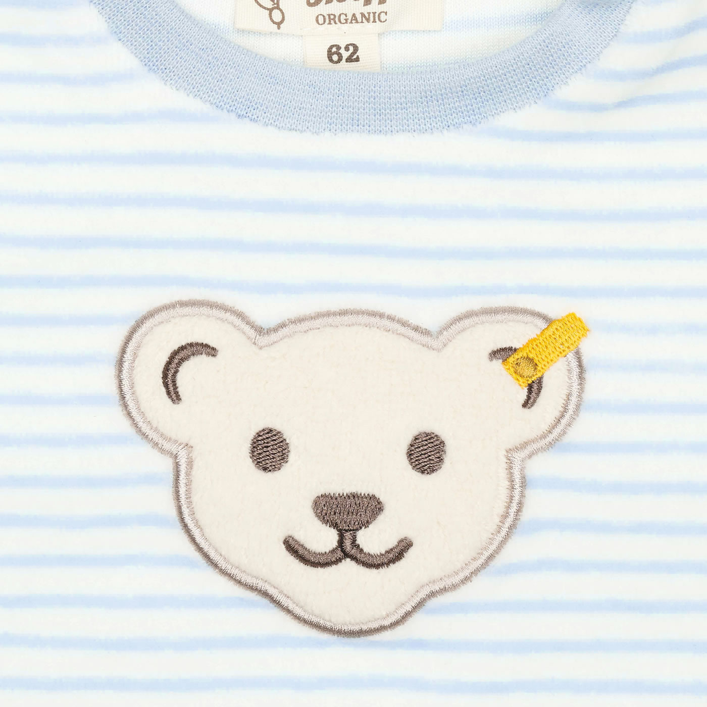 Hübsches Set bestehend aus Hose und Sweatshirt aus der Baby Wellness-Kollektion von STEIFF. Der STEIFF Bär ziert die Vorderseite des geringelten Shirts. Zwei Druckknöpfe am Halsausschnitt erleichetrn das An-und Ausziehen. Das weiche Nicki- Material aus organischer Baumwolle bietet einen hohen Tragekomfort.