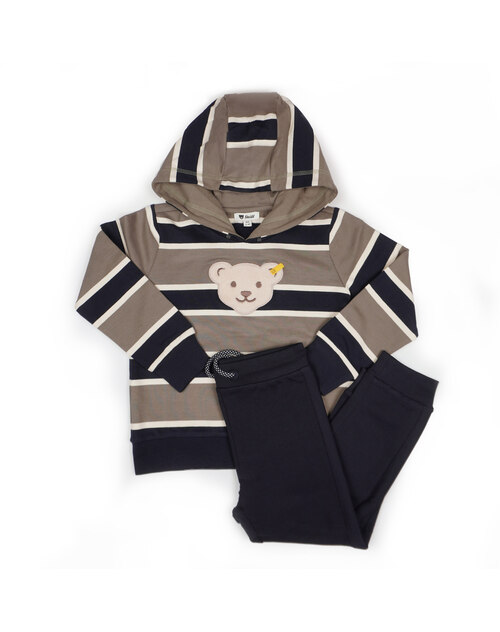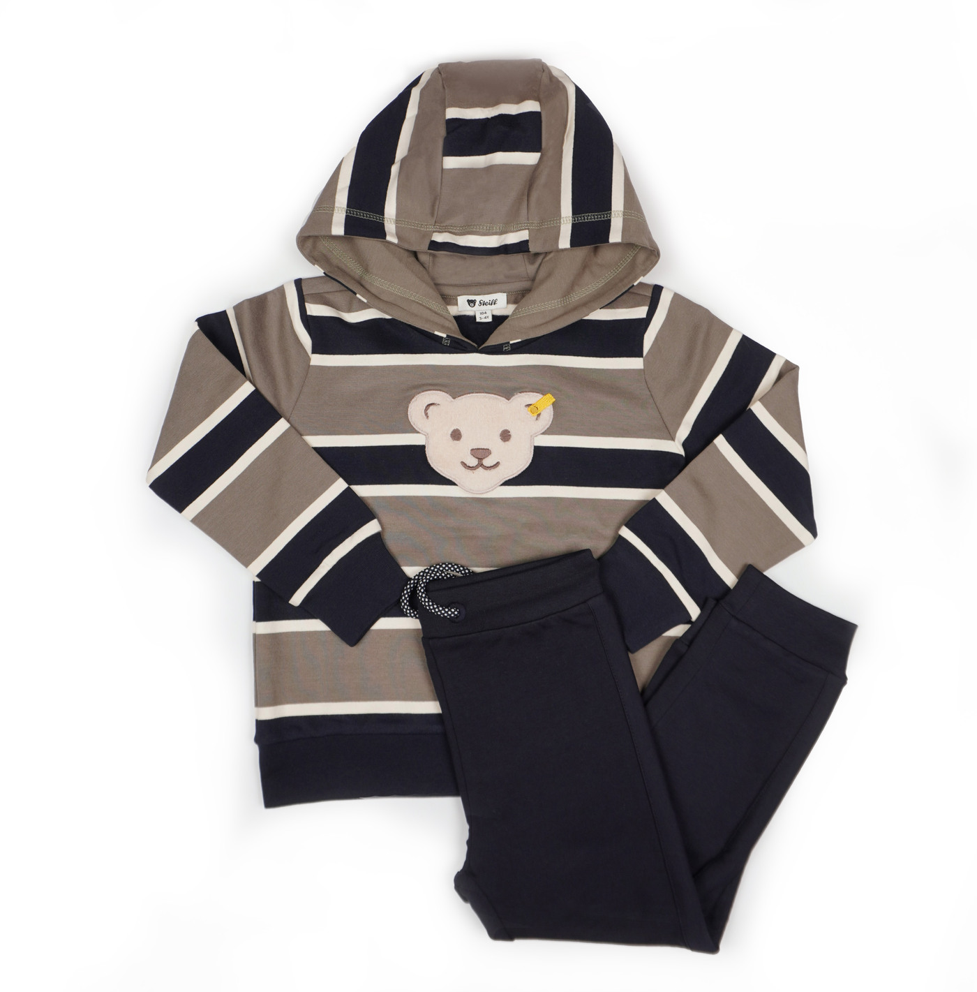 Bestehend aus einer blauen Sweat-Hose und dem getreiftem Sweatshirt mit Kapuze und aufgenähtem Steiff-Bären.