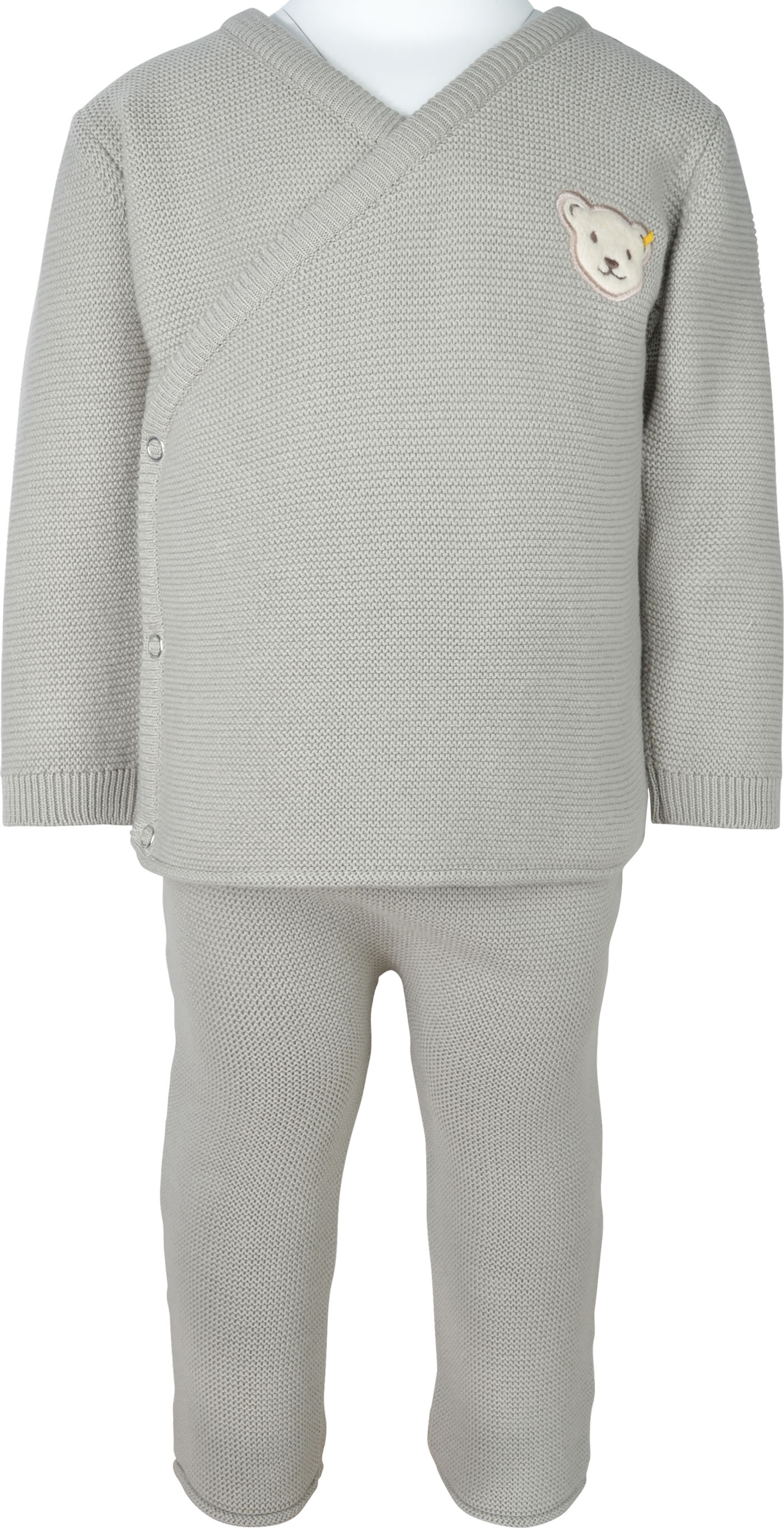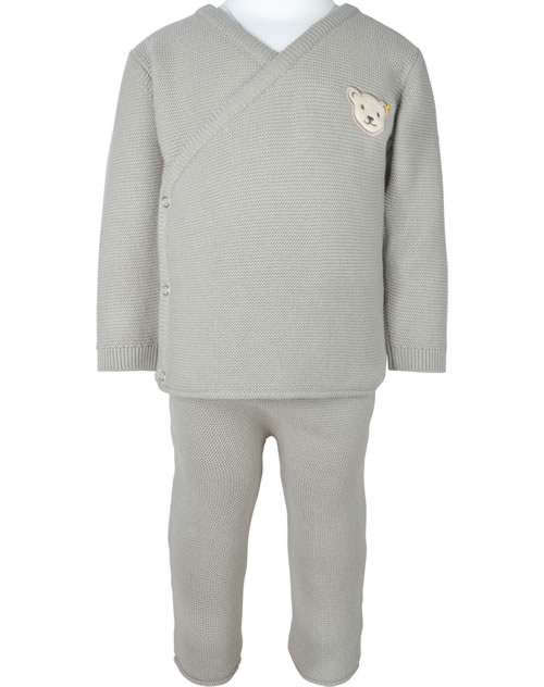 Hübsches Strickset bestehend aus Hose und Wickeljacke aus der Baby Organic Half Moon Kollektion von STEIFF. Das Oberteil lässt sich mit Druckknöpfen schließen. Schöne Details sind der STEFF Bär auf Jacke und Hose und die Rollränder am Saum. Das weiche Material aus ökologischer Baumwolle bietet einen hohen Tragekomfort.