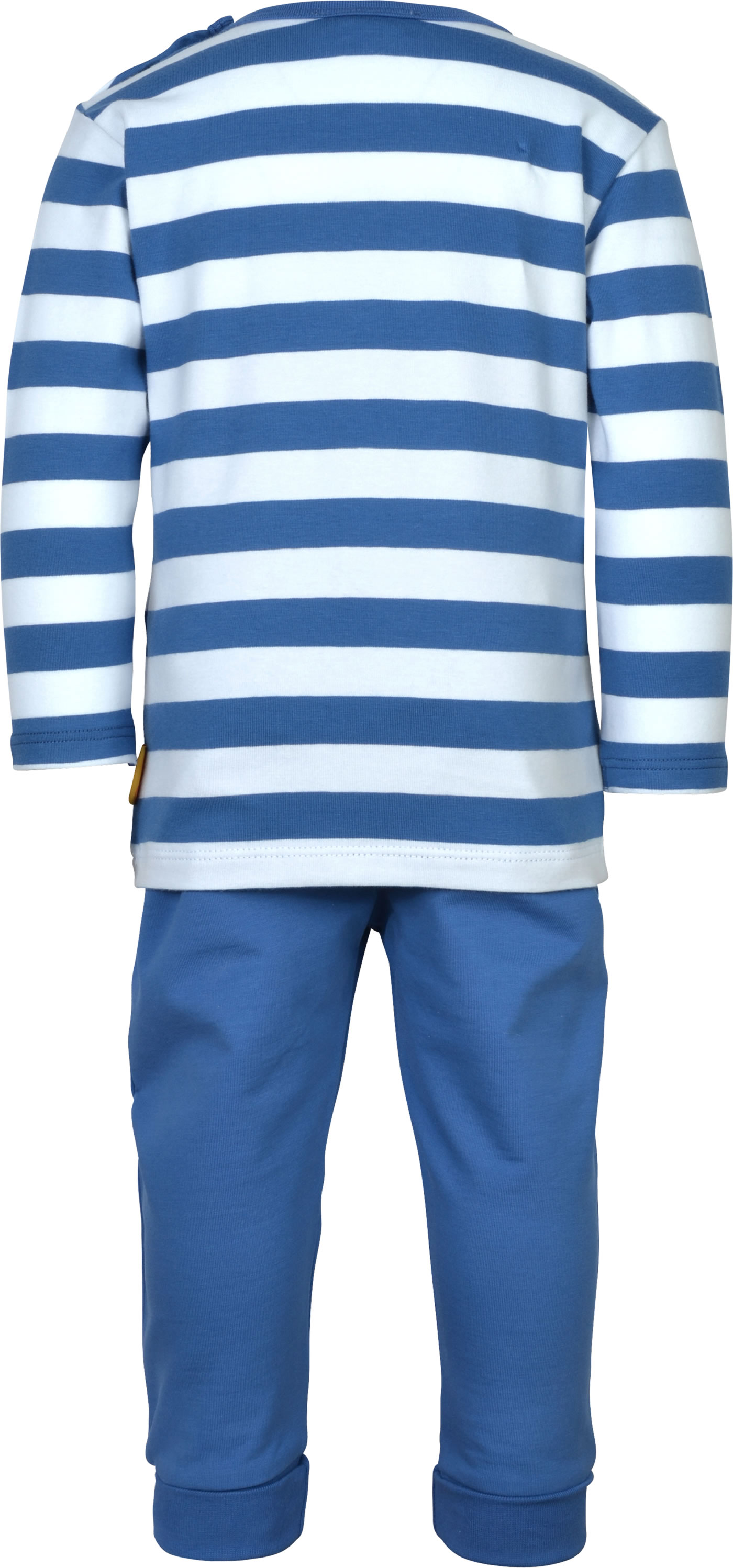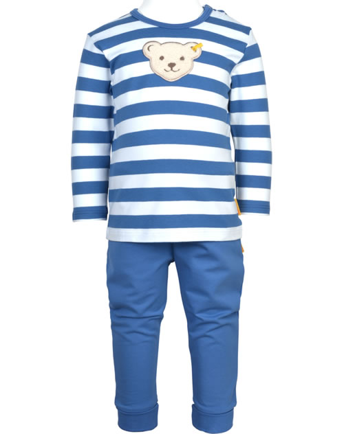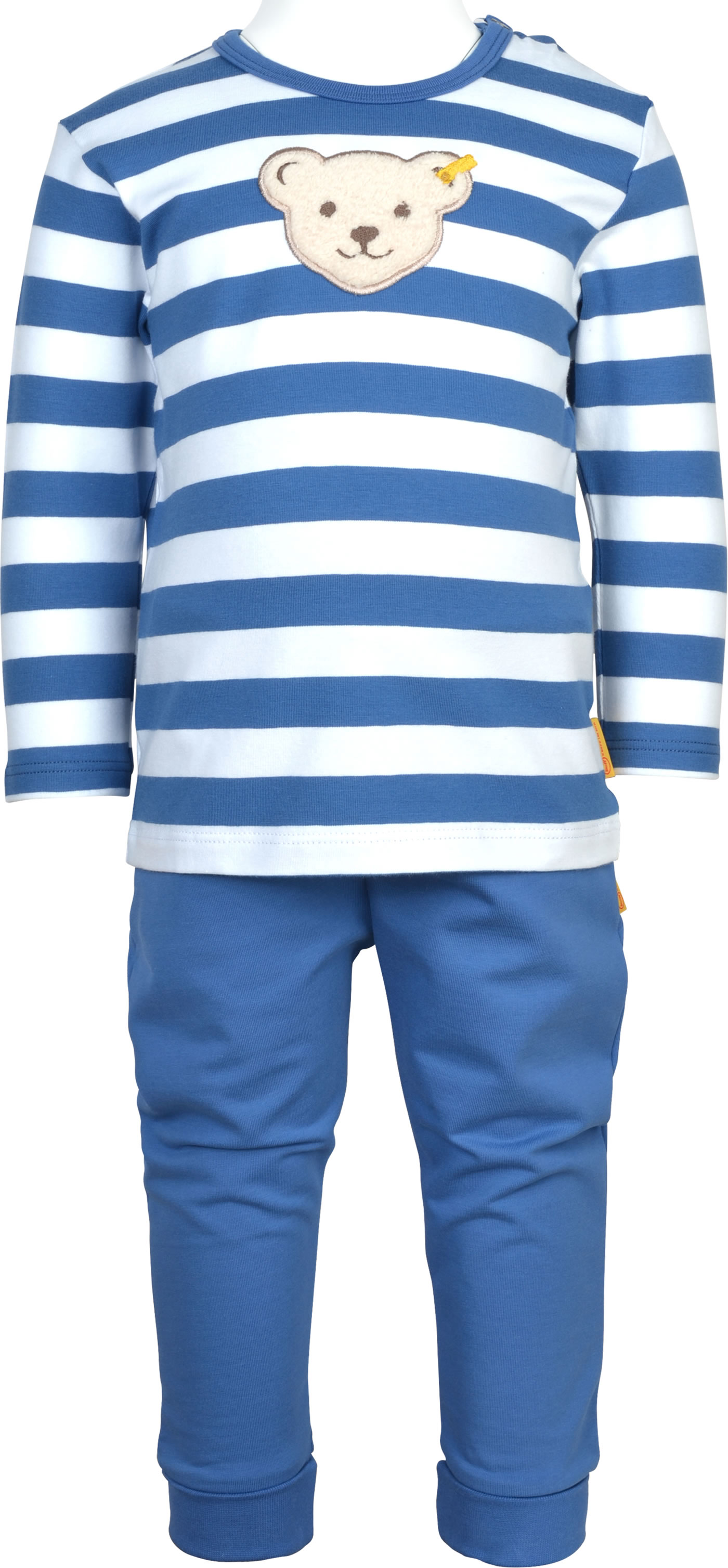 Hübsches Set mit Shirt und Hose von STEIFF für Jungen aus der Happy Hippo-Kollektion. Das Langarmshirt ist gestreift und wird mit der blauen Hose perfekt ergänzt. Der kleine STEIFF Bär ziert die Vorderseite des Shirts. Dank der zwei Knöpfe am Halsausschnitt wird das An- und Ausziehen zum Kinderspiel. Der weiche Gummizugbund am Bauch der Jerseyhose sorgt für einen bequemen Sitz.