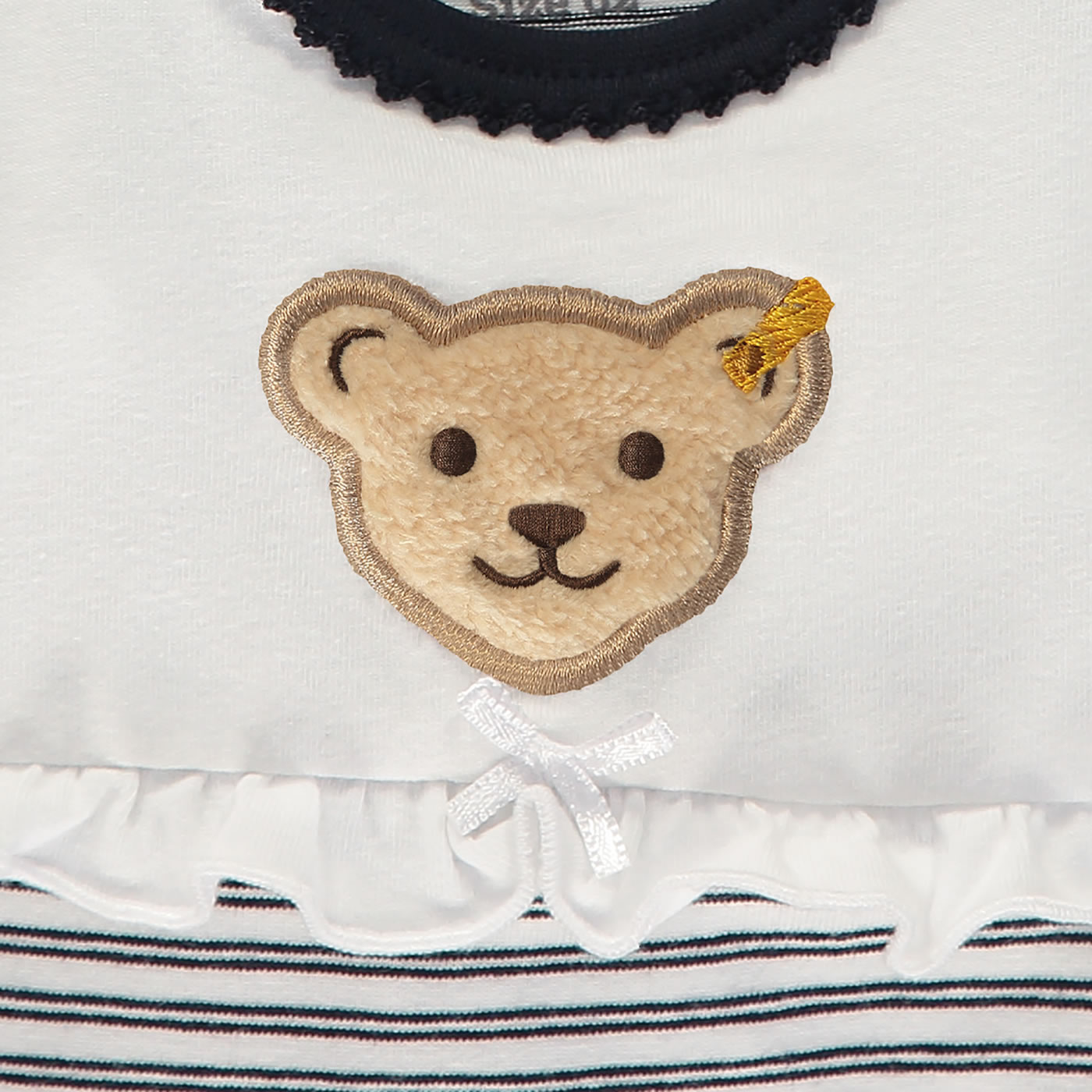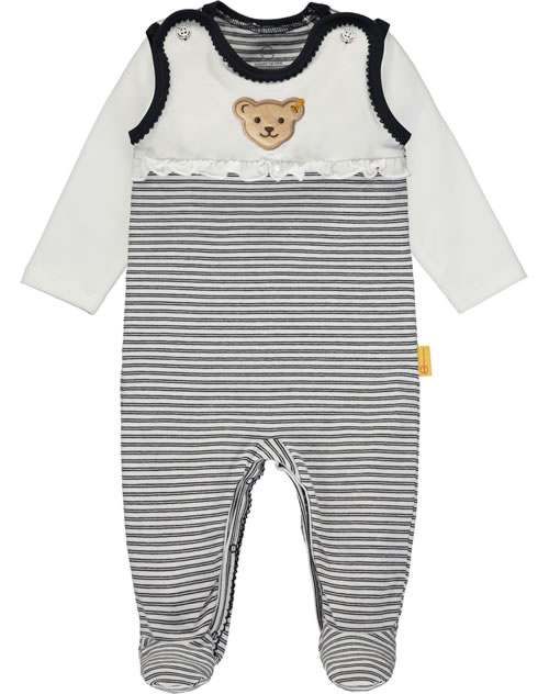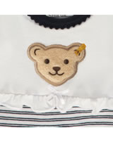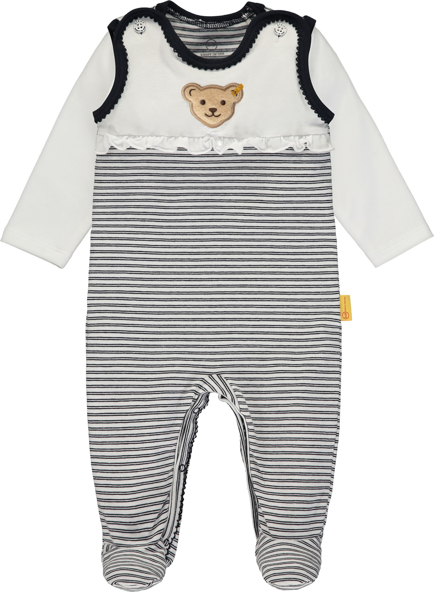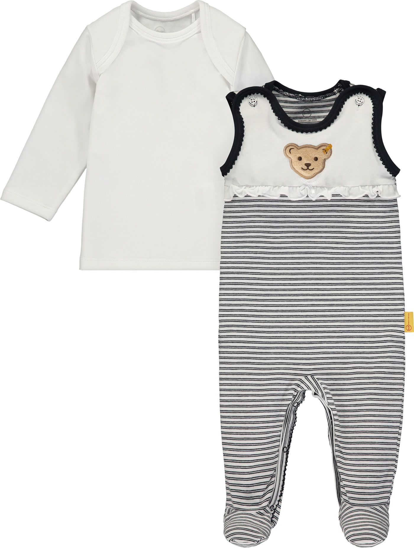 Hübsches Set aus Strampler mit Füßen und Shirt für Mädchen aus der Ahoi Babyt-Kollektion von STEIFF. Das Oberteil des Stramplers ist in weiß gehalten und der Strampler aus Baumwolle ist hübsch gestreift. Auf der Brust befindet sich der kleine Steiff Bär mit einer Schleife. Die durchgehenden Druckknöpfe erleichtern das An-und Ausziehen.