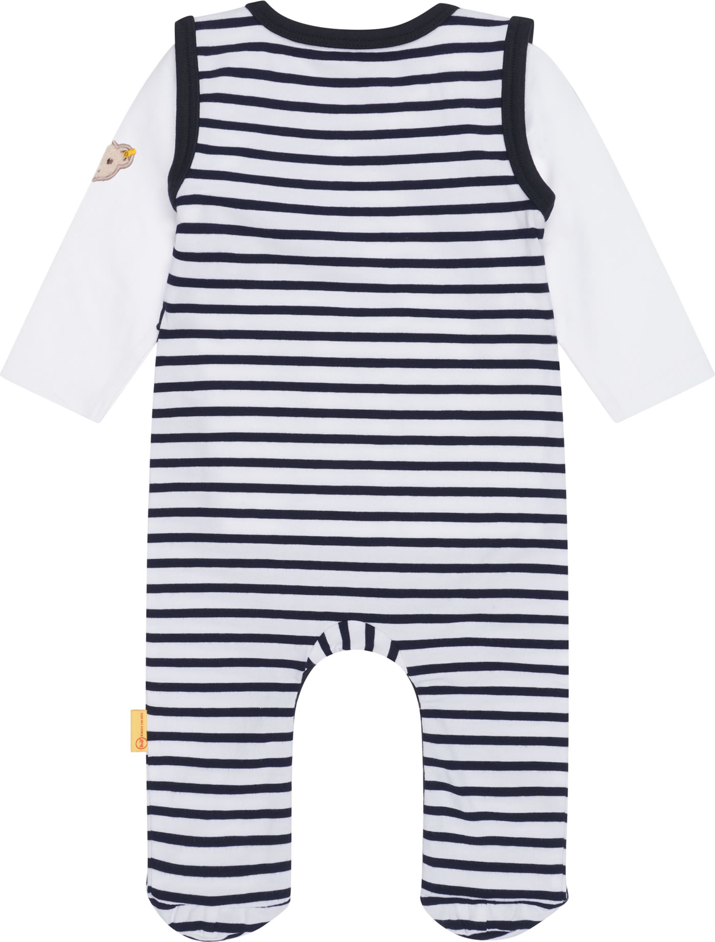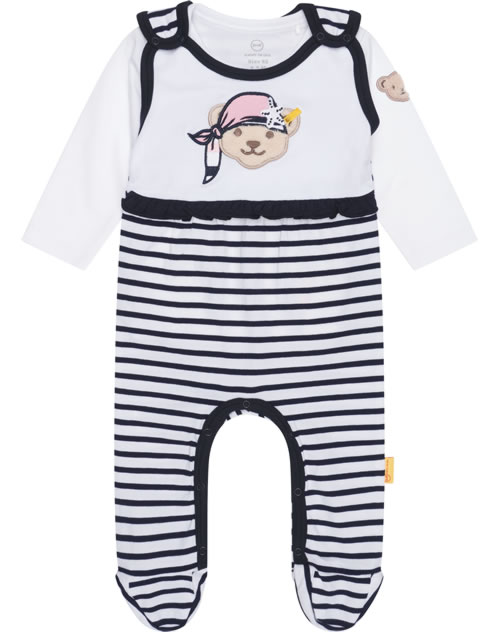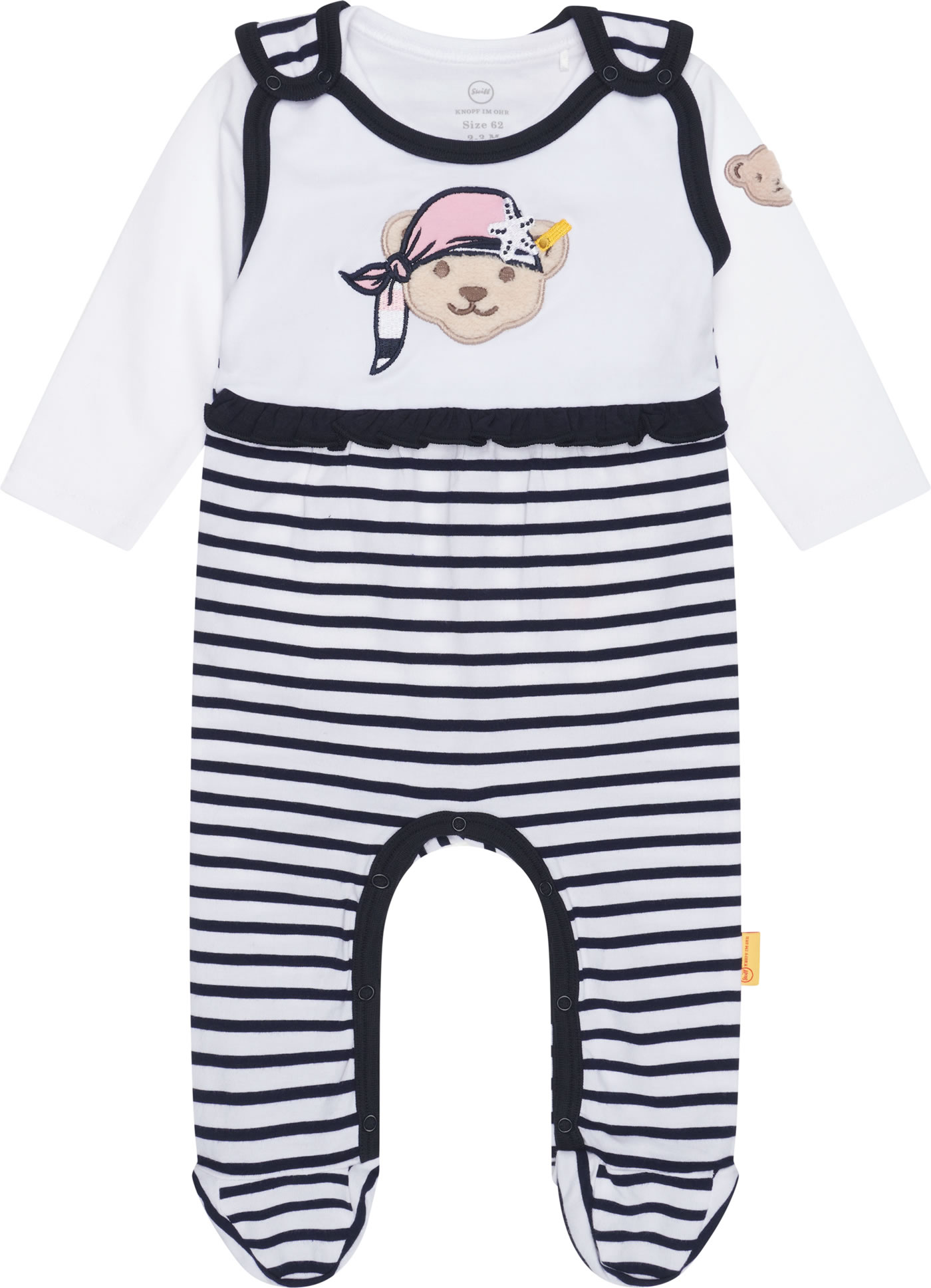 Gestreifter Strampler aus weichem Baumwoll-Material und passendes Shirt aus der Beach Please-Kollektion von STEIFF für Mädchen. Der STEIFF Bär mit Piratenkopftuch ziert die Brust des Stramplers. Schlupfkragen am Shirt und Druckknöpfe auf Schultern und im Schritt des Stramplers erleichtern das An- und Ausziehen.