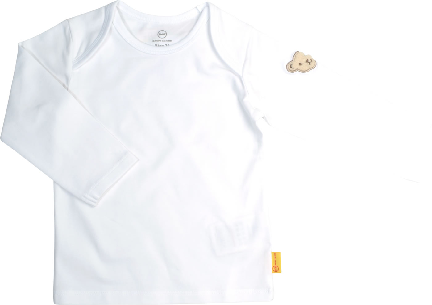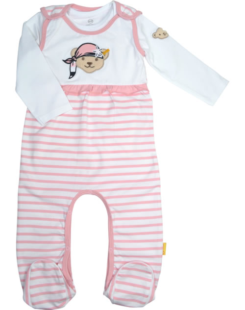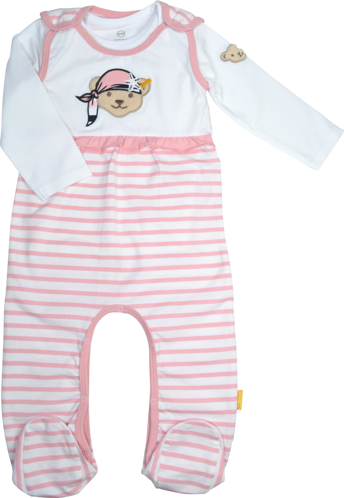 Gestreifter Strampler aus weichem Baumwoll-Material und passendes Shirt aus der Beach Please-Kollektion von STEIFF für Mädchen. Der STEIFF Bär mit Piratenkopftuch ziert die Brust des Stramplers. Schlupfkragen am Shirt und Druckknöpfe auf Schultern und im Schritt des Stramplers erleichtern das An- und Ausziehen.