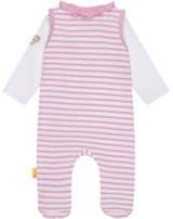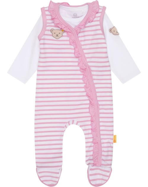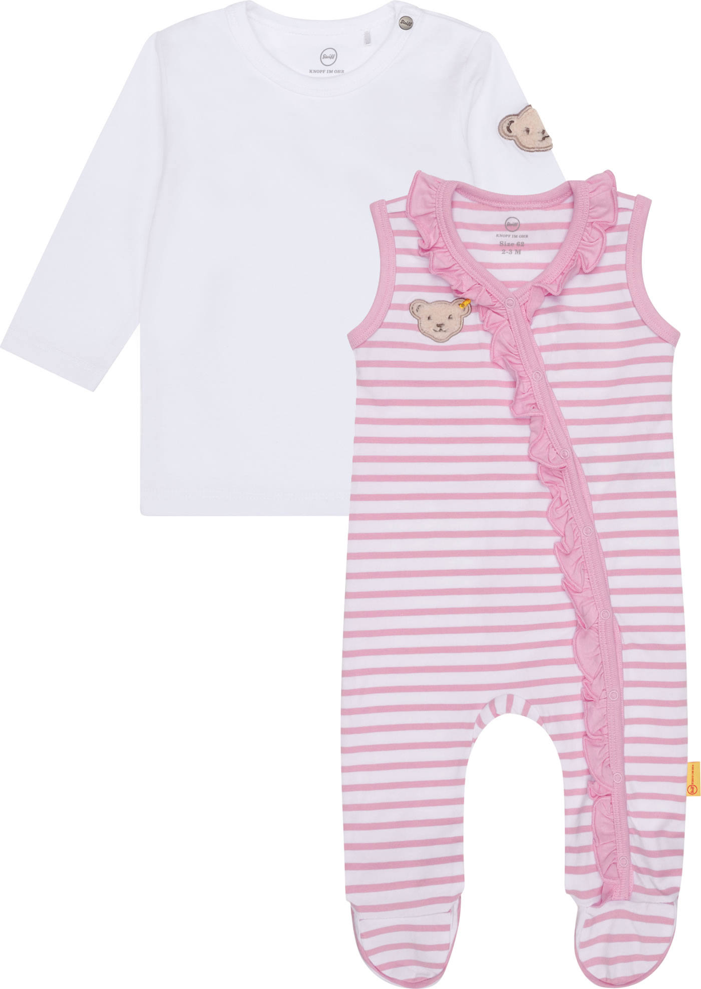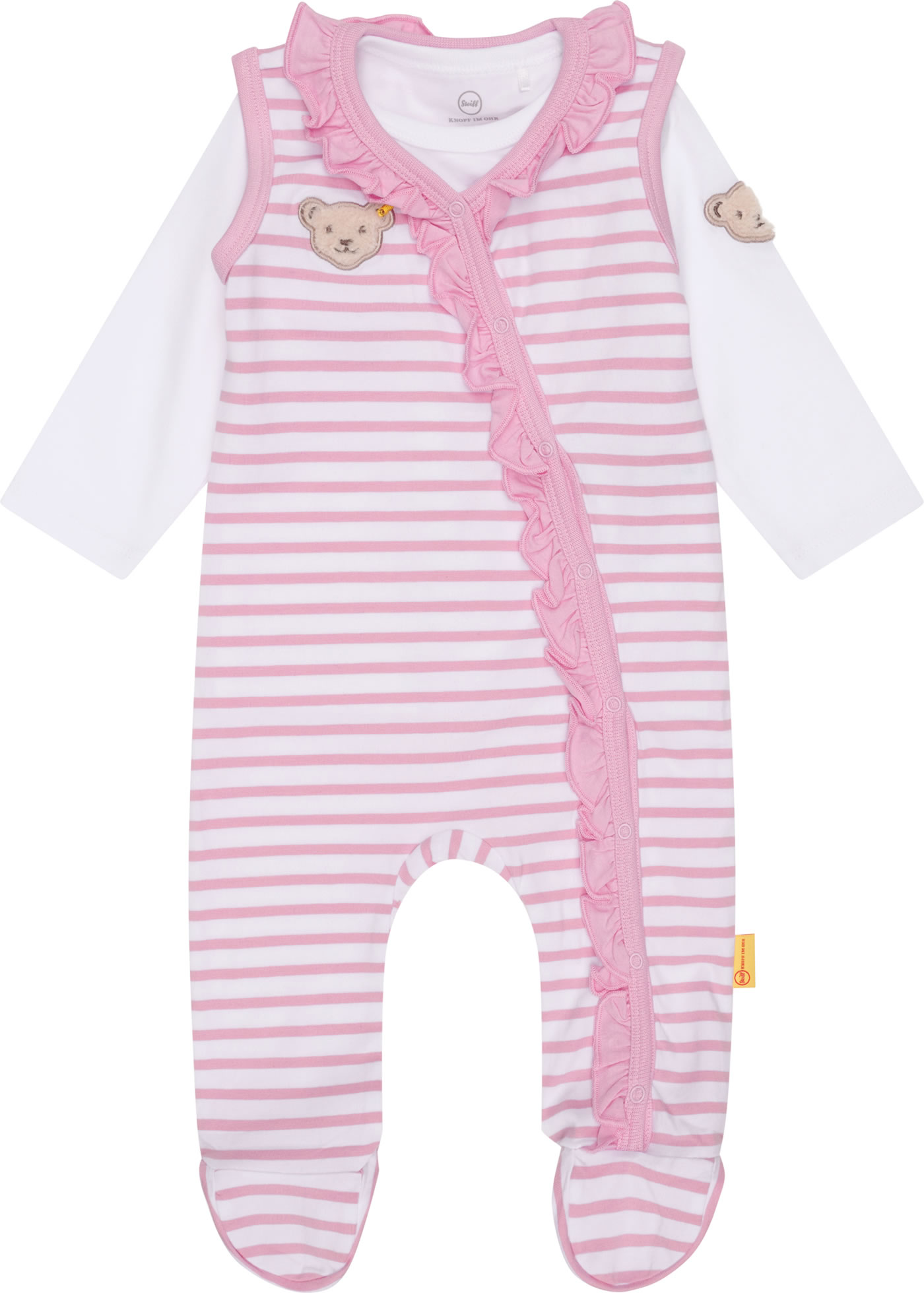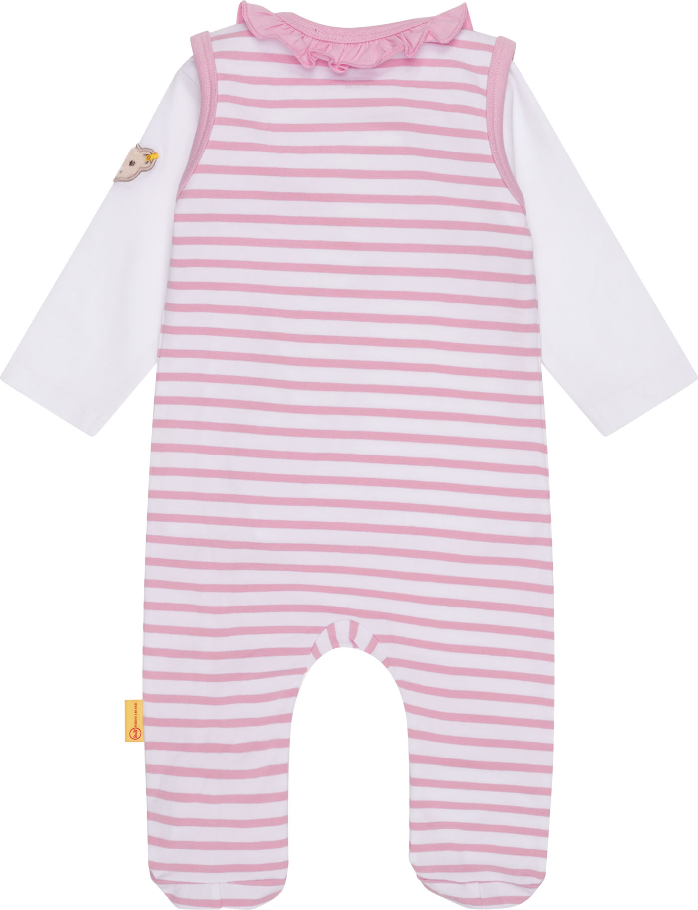 Gestreifter Strampler aus weichem Baumwoll-Material und passendes Shirt aus der Beach Please-Kollektion von STEIFF für Mädchen. Der STEIFF Bär ziert die Brust des Stramplers. Druckknöpfe auf der Schulter des Shirts und eine durchgehende Druckknopfleiste am Strampler erleichtern das An- und Ausziehen. Ein schönes Detail sind die Rüschen am Strampler.