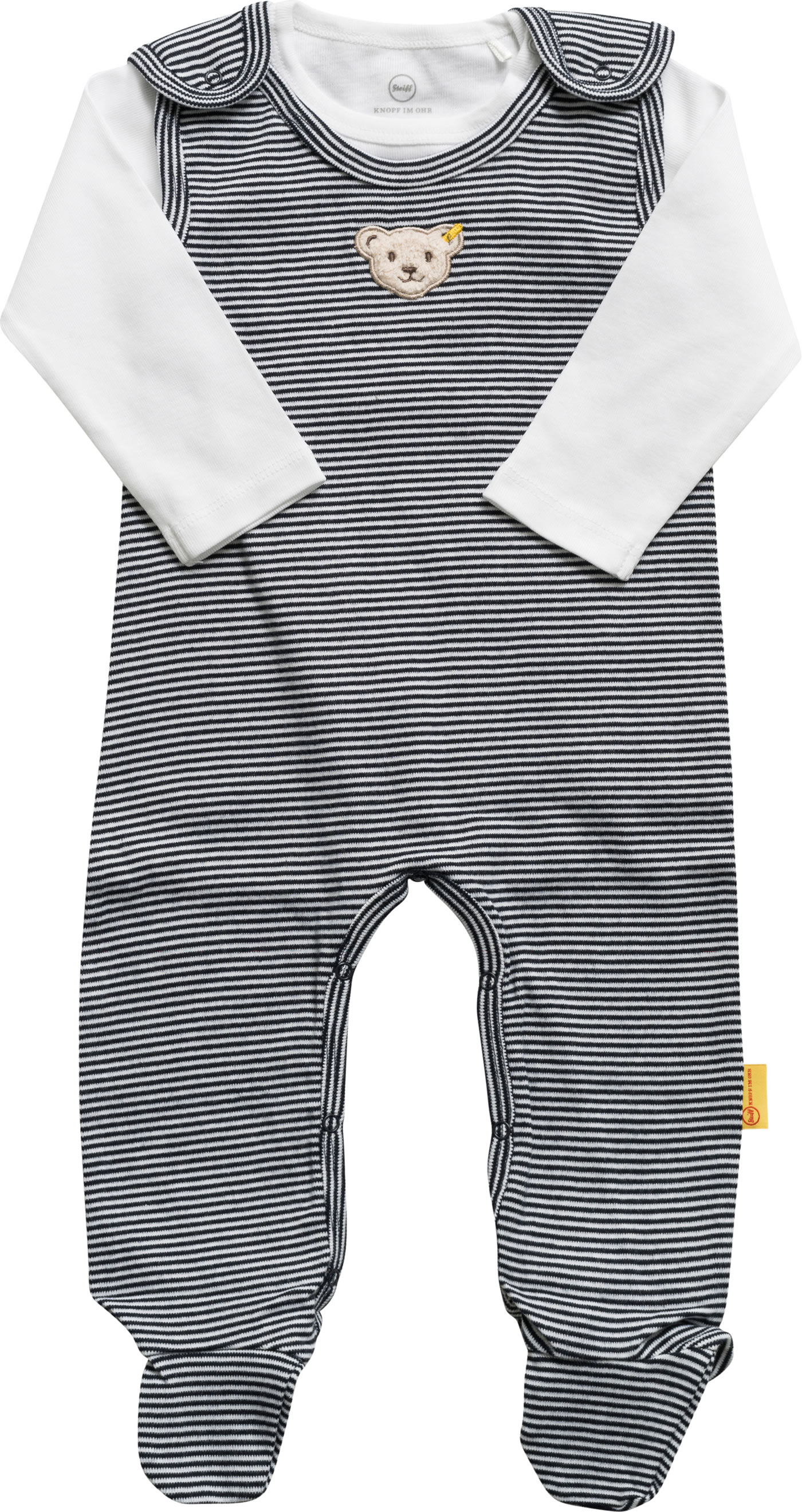 Gestreifter Strampler aus weichem Baumwoll-Material und passendes Shirt in weiß aus der Basic-Kollektion von STEIFF für Jungen und Mädchen. Die Druckknöpfe im Schritt und auf den Schultern erleichtern das An-und Ausziehen. Der STEIFF Bär ziert die Brust. Das Shirt hat ebenfalls Druckknöpfe, die das An- und Ausziehen erleichtern.