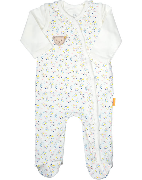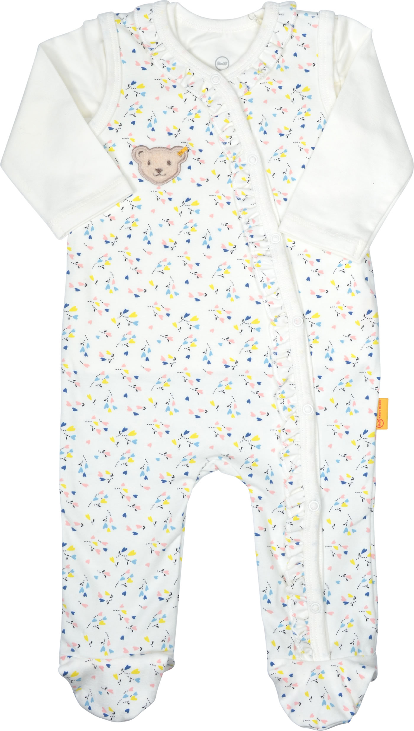 Geblümter Strampler aus weichem Baumwoll-Material und passendes Shirt aus der Sweet Heart-Kollektion von STEIFF für Mädchen. Die durchgehende Druckknopfleiste und der Kragen sind mit Rüschen verziert. Der STEIFF Bär ziert die Brust. Das Shirt hat Druckknöpfe auf der Schulter, die das An- und Ausziehen erleichtern.