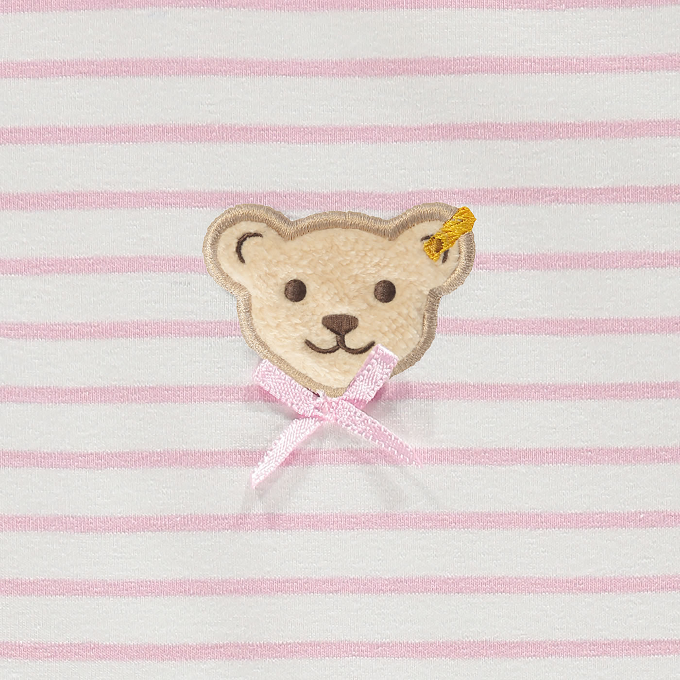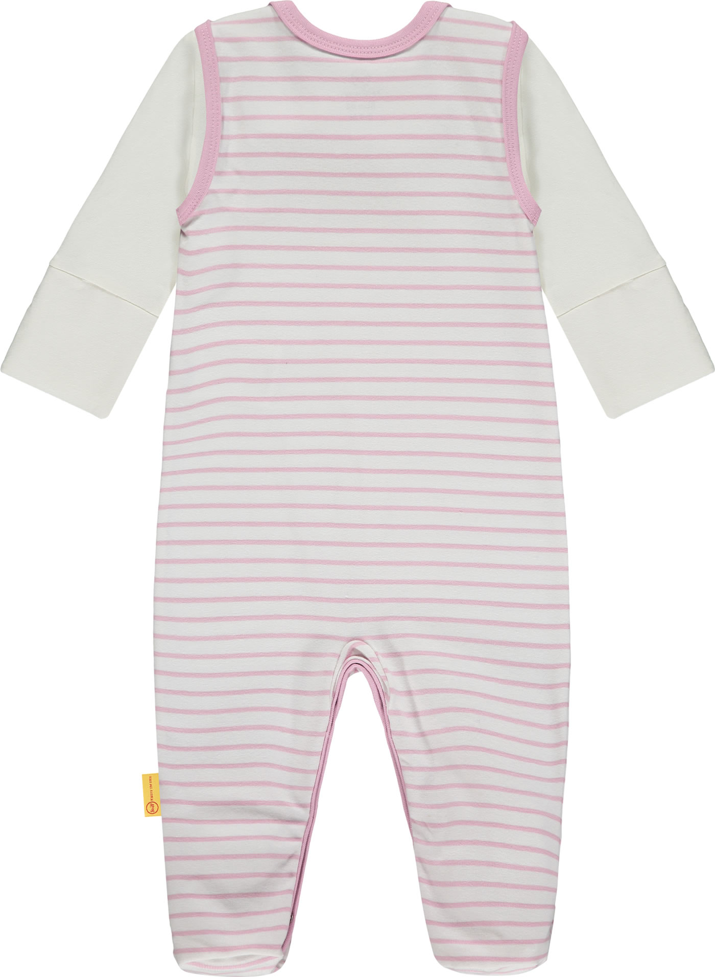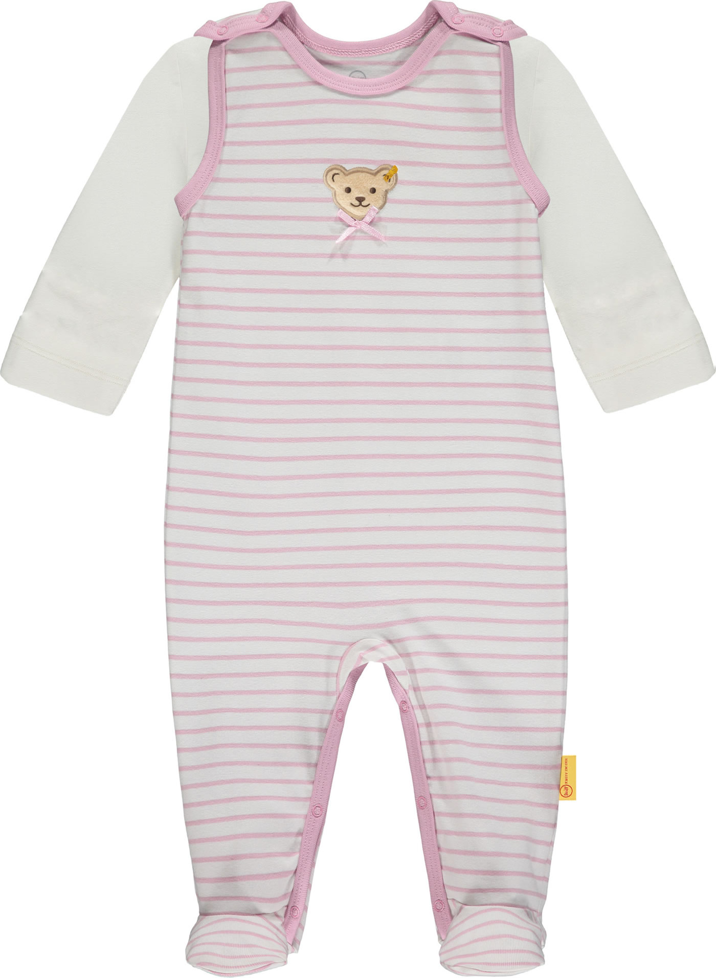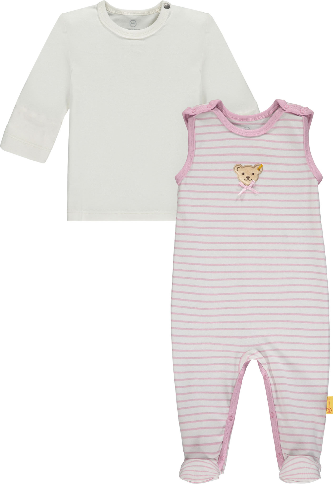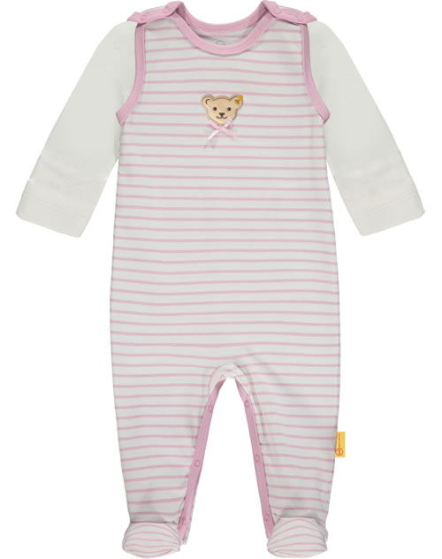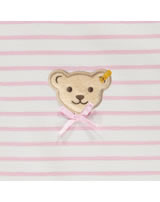 Gestreifter Strampler aus weichem Baumwoll-Material und passendes Shirt aus der Sweet Heart-Kollektion von STEIFF für Mädchen. Der STEIFF Bär auf der Brust wird von einer kleinen Schleife verziert. Druckknöpfe auf den Schultern und im Schritt erleichtern das An- und Ausziehen.
