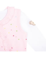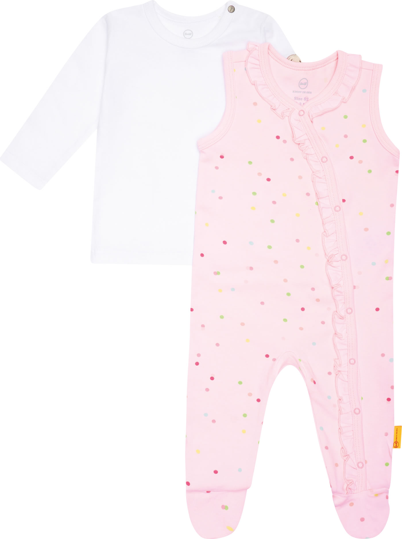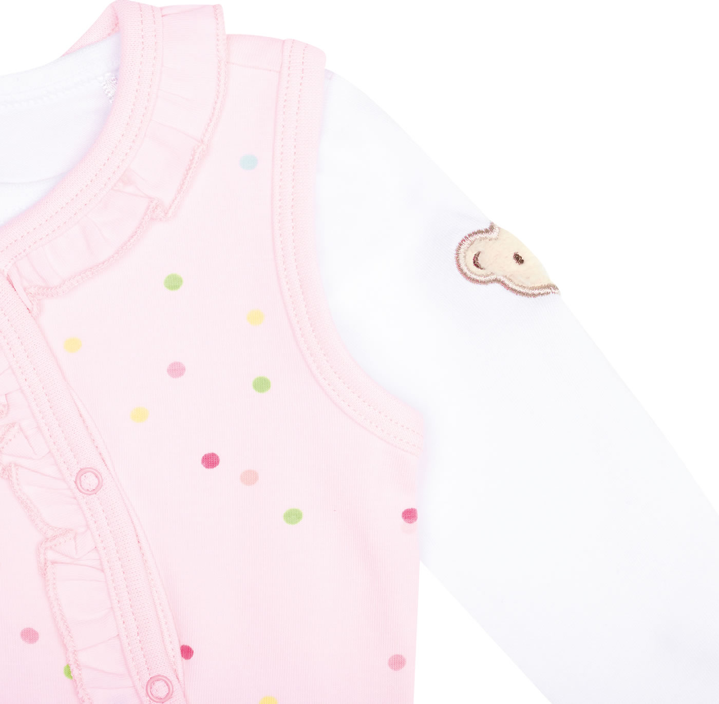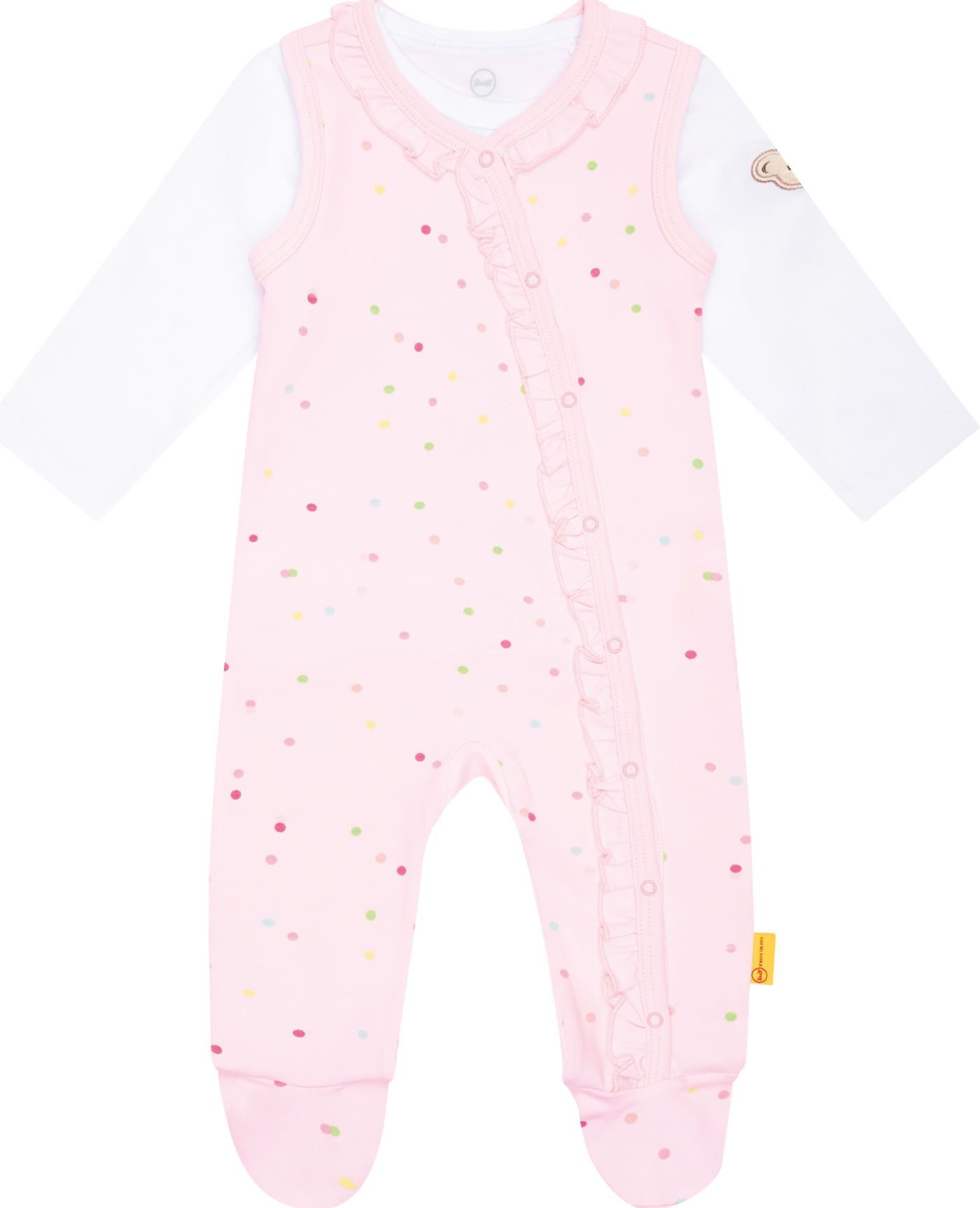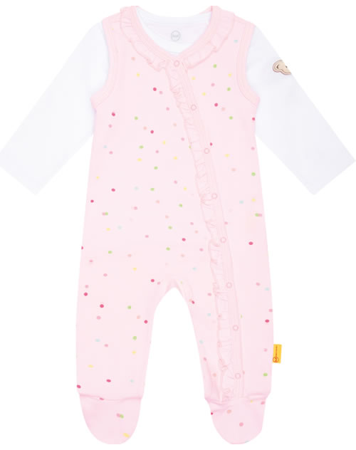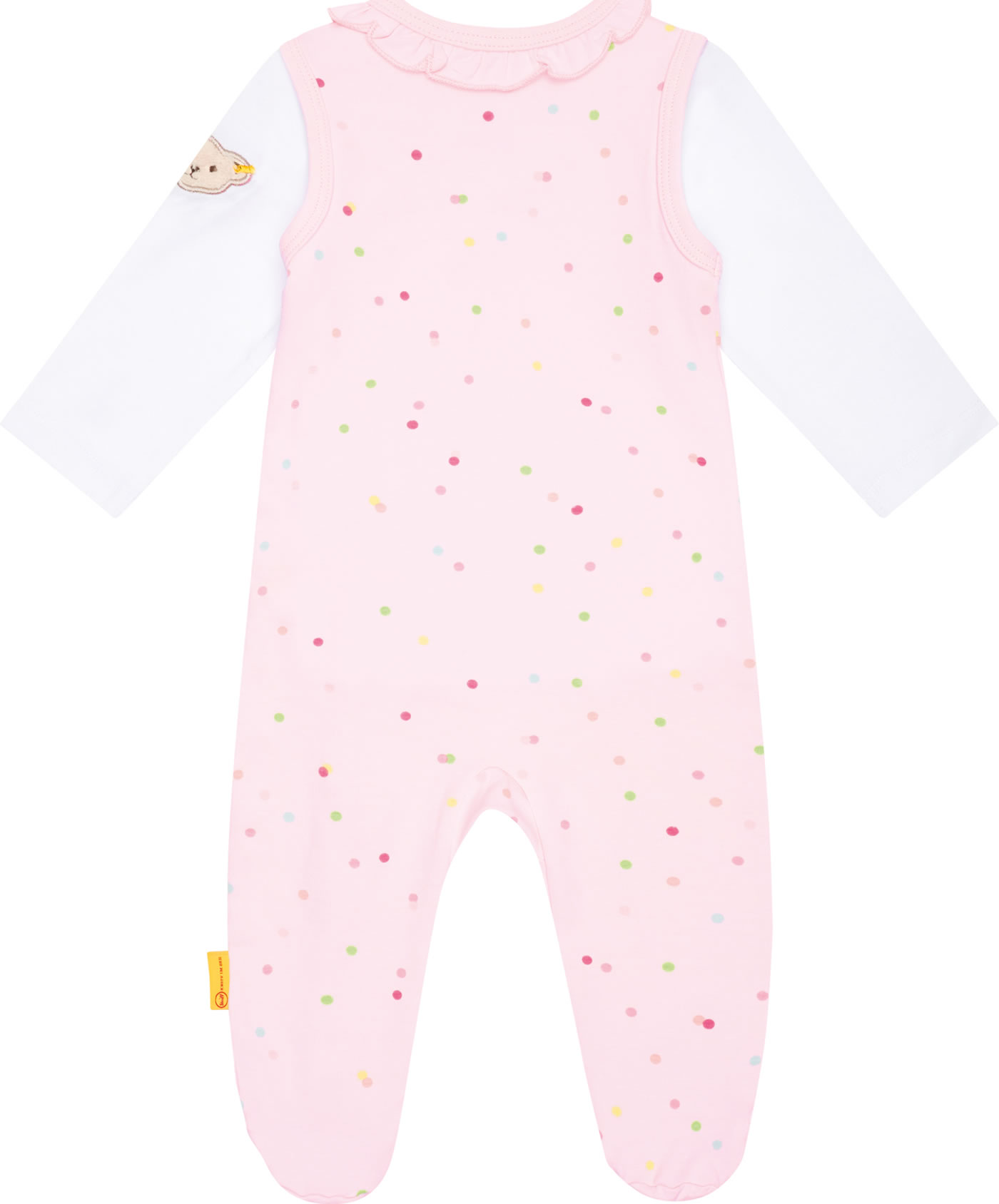 Gepunkteter Strampler aus weichem Baumwoll-Material und passendes Shirt aus der Garden Party-Kollektion von STEIFF für Mädchen. Die durchgehende Druckknopfleiste ist mit Rüschen besetzt und erleichtert das An- und Ausziehen. Das Shirt hat einen Druckknöpfe auf der Schulter und der STEIFF Bär ziert den linken Ärmel.