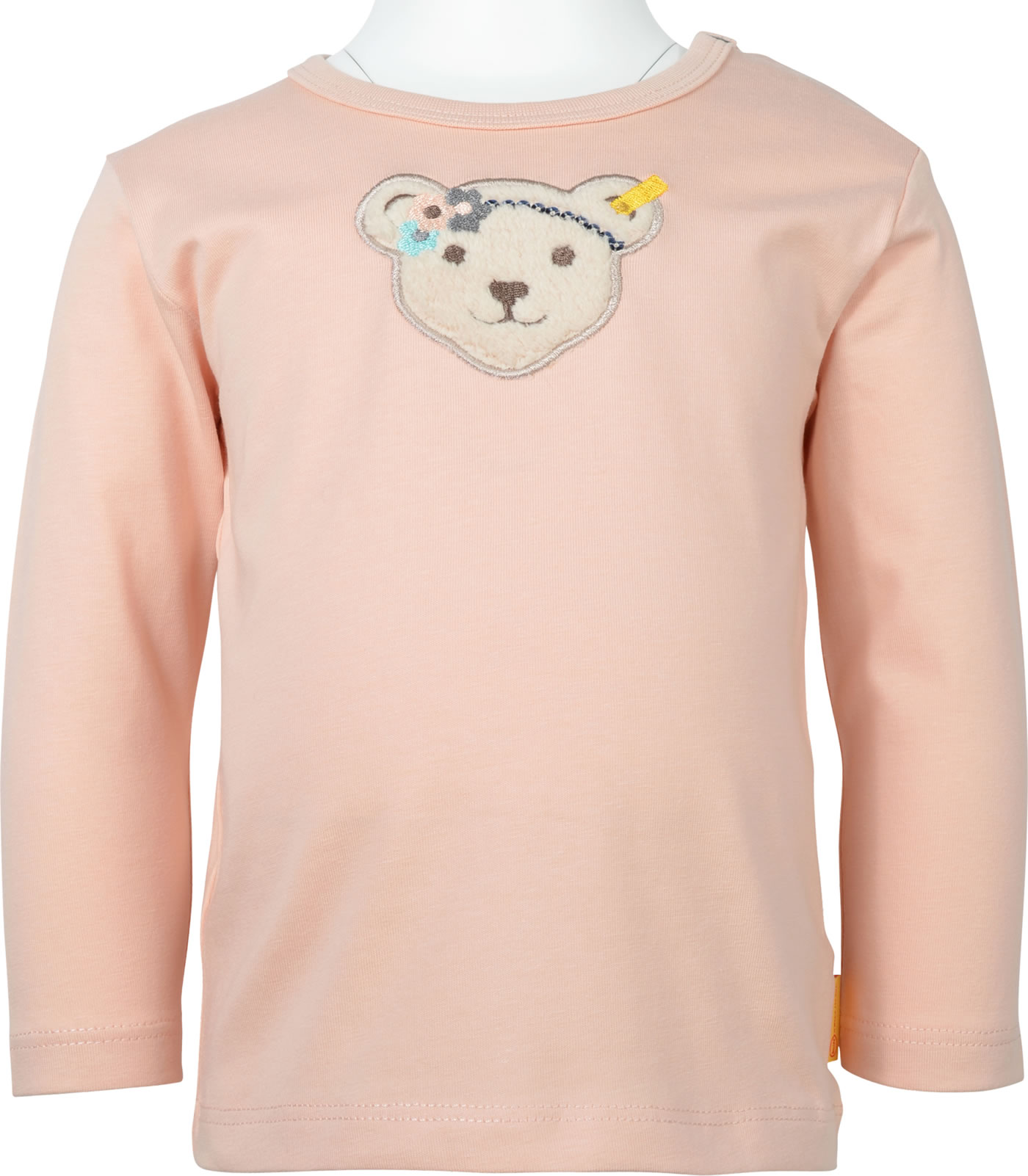 Langarm-Shirt für Mädchen aus der Bird's Twittering-Kollektion von STEIFF. Der STEIFF Bär auf der Brust trägt ein Haarband aus Pailletten und ist mit bunten Blüten verziert. Druckknöpfe auf der Schulter erleichtern das An- und Ausziehen.