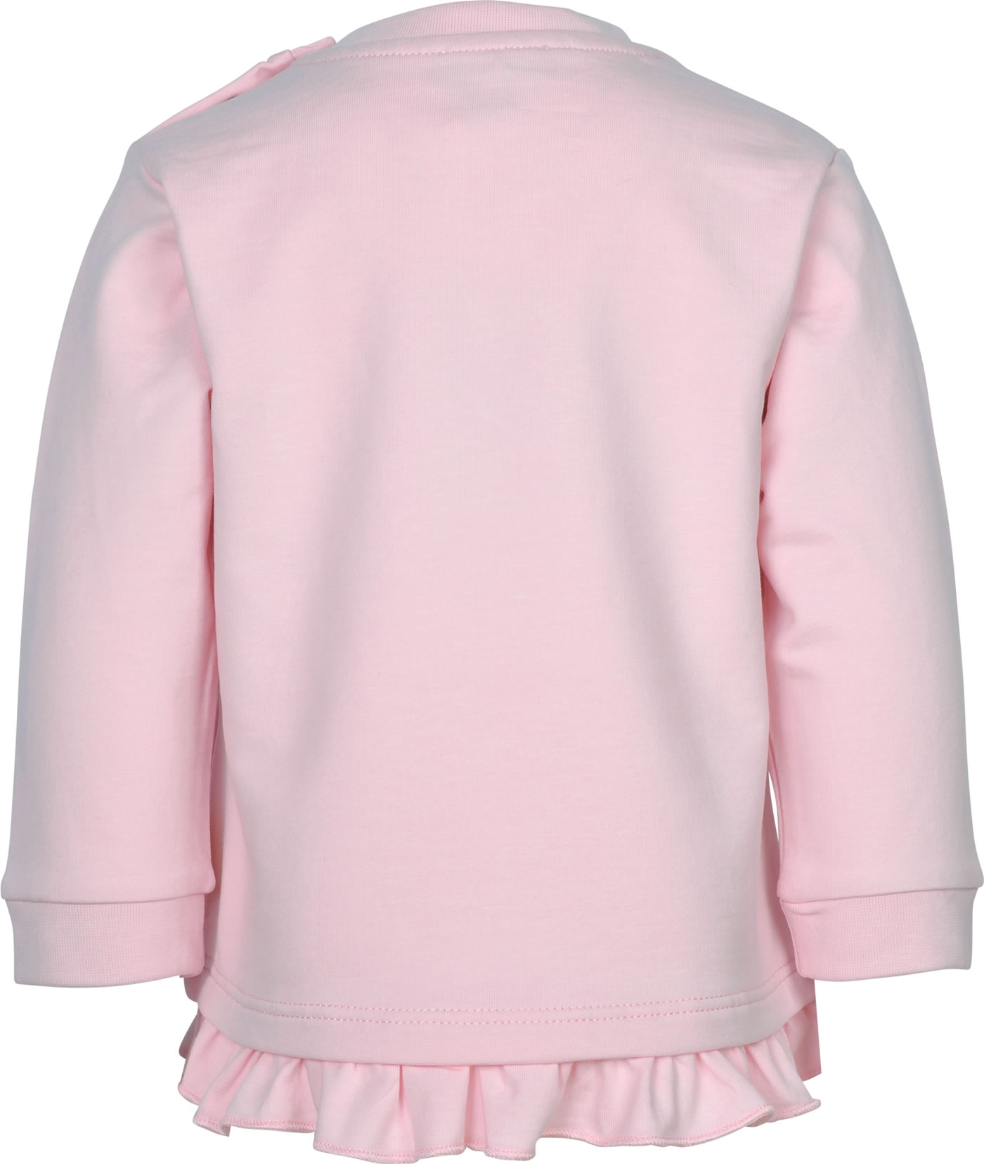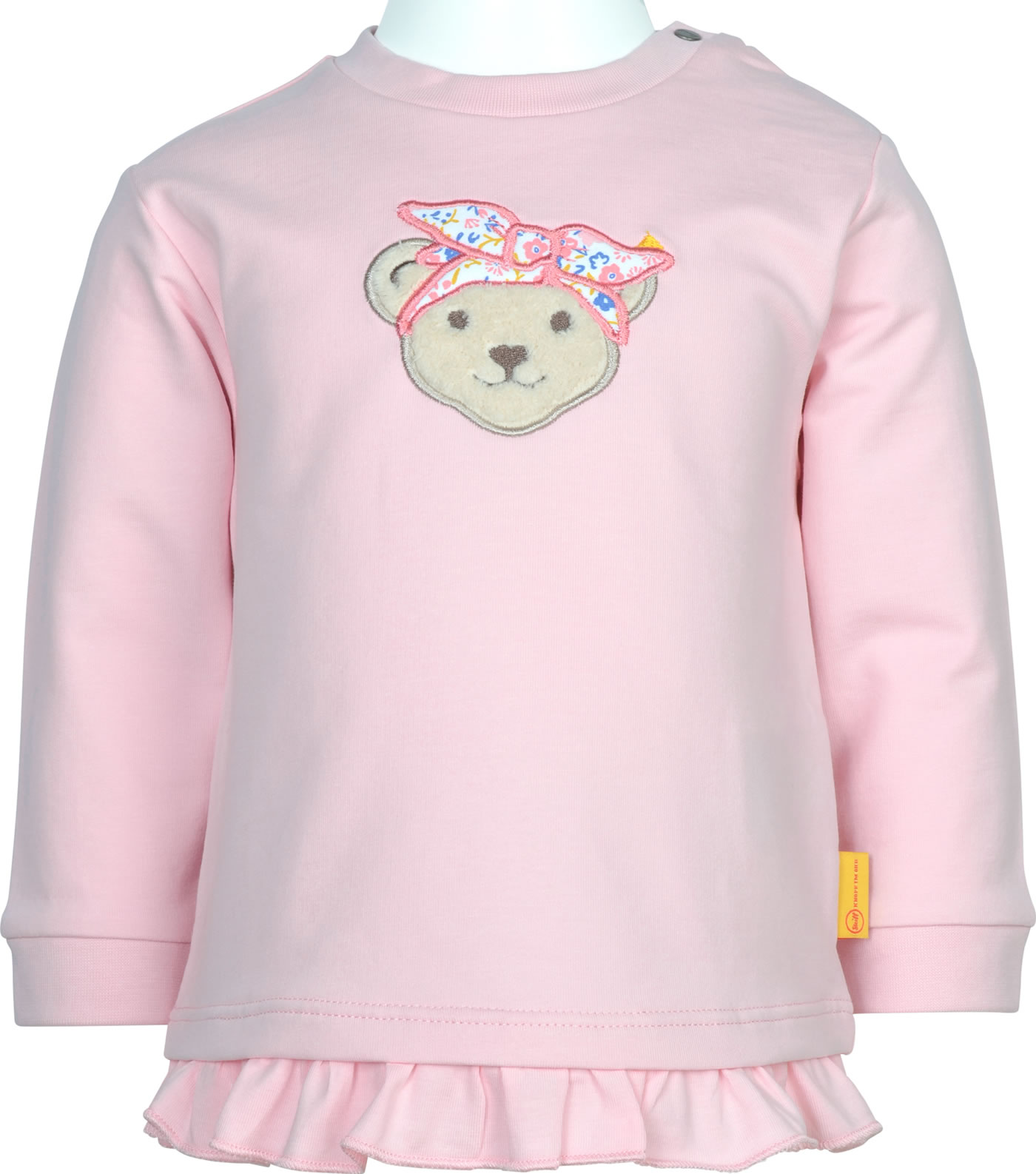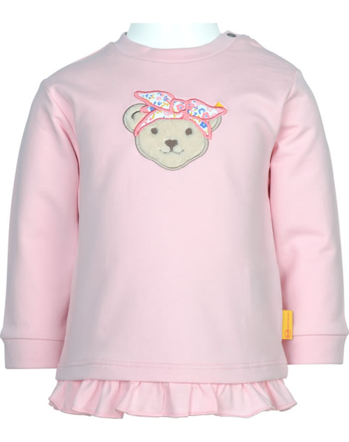 Langarm-Shirt für Mädchen aus der Serendipity-Kollektion von STEIFF. Der STEIFF Bär ziert die Vorderseite. Ein verspielter Rüschenabschluss rundet den Look ab. Druckknöpfe auf der Schulter helfen beim An- und Ausziehen.