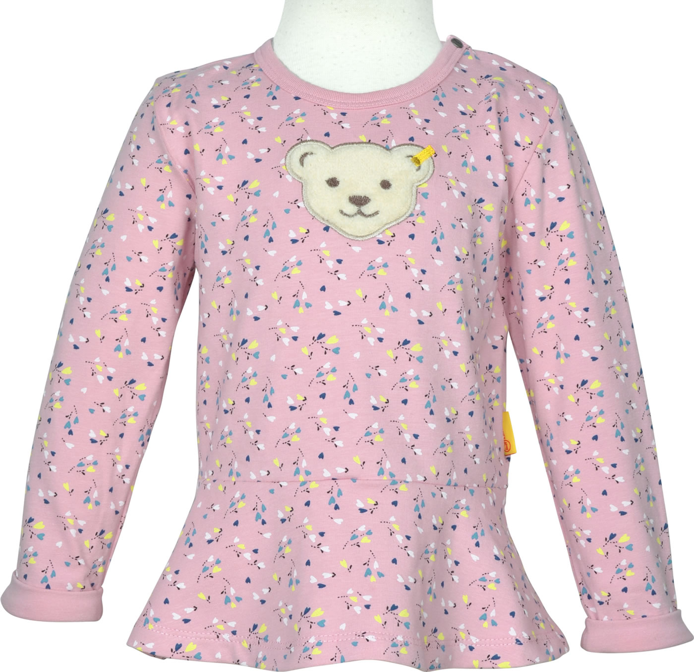 Langarm-Shirt für Mädchen aus der Sweet Heart-Kollektion von STEIFF. Ein toller Hingucker ist der große STEIFF Bär auf der Vorderseite. Schöne Details sind die gekrempelten Ärmel und der abgesetzte Schoß. Druckknöpfe auf der Schulter erleichtern das An- und Ausziehen.