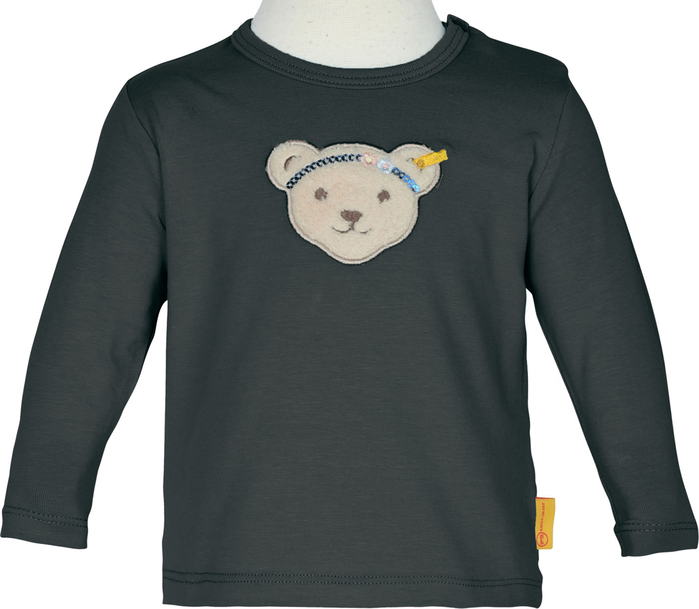 Langarm-Shirt für Mädchen aus der Sweet Heart-Kollektion von STEIFF. Ein toller Hingucker ist der STEIFF Bär mit Pailletten-Stirnband auf der Vorderseite. Druckknöpfe auf der Schulter erleichtern das An- und Ausziehen.
