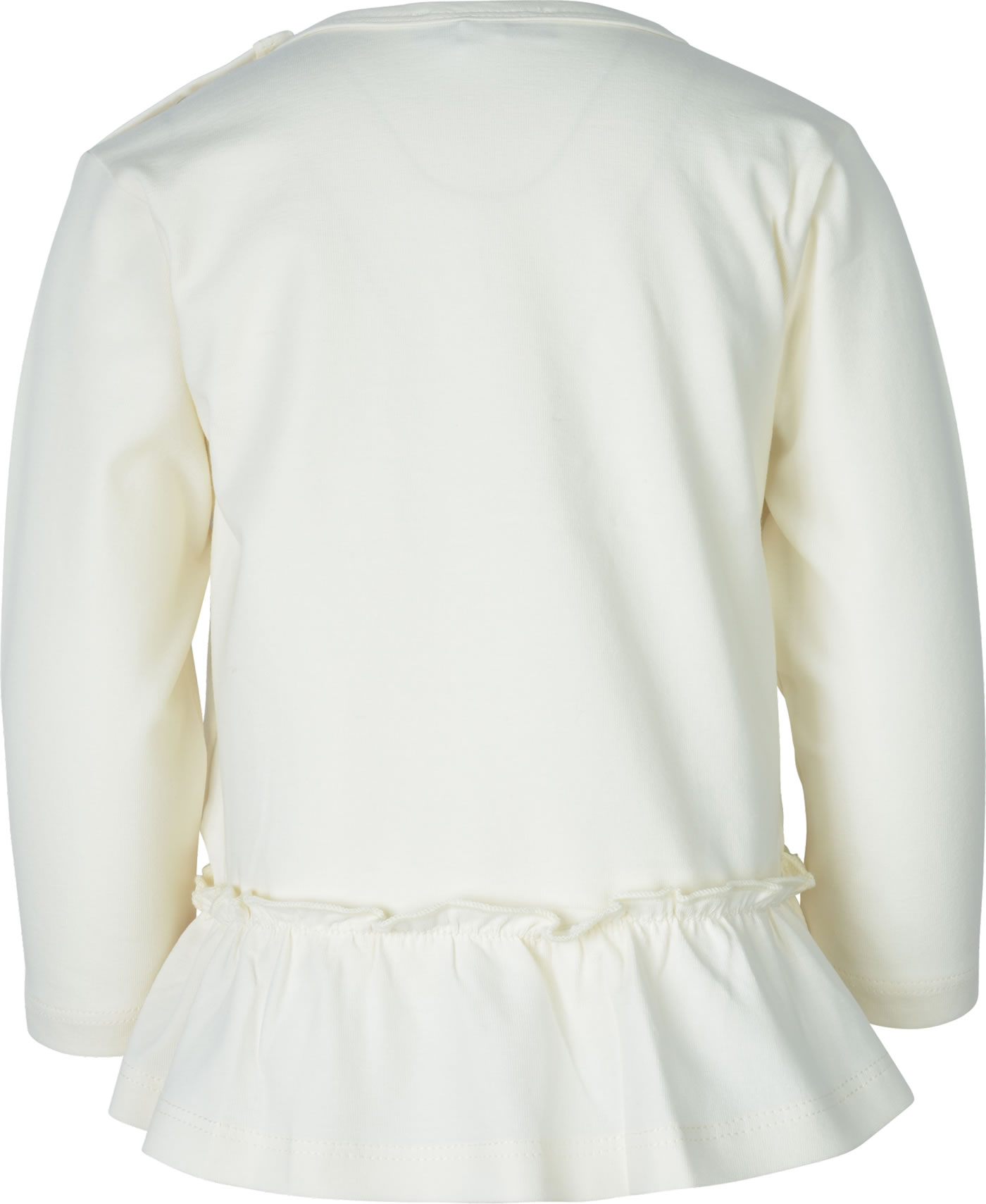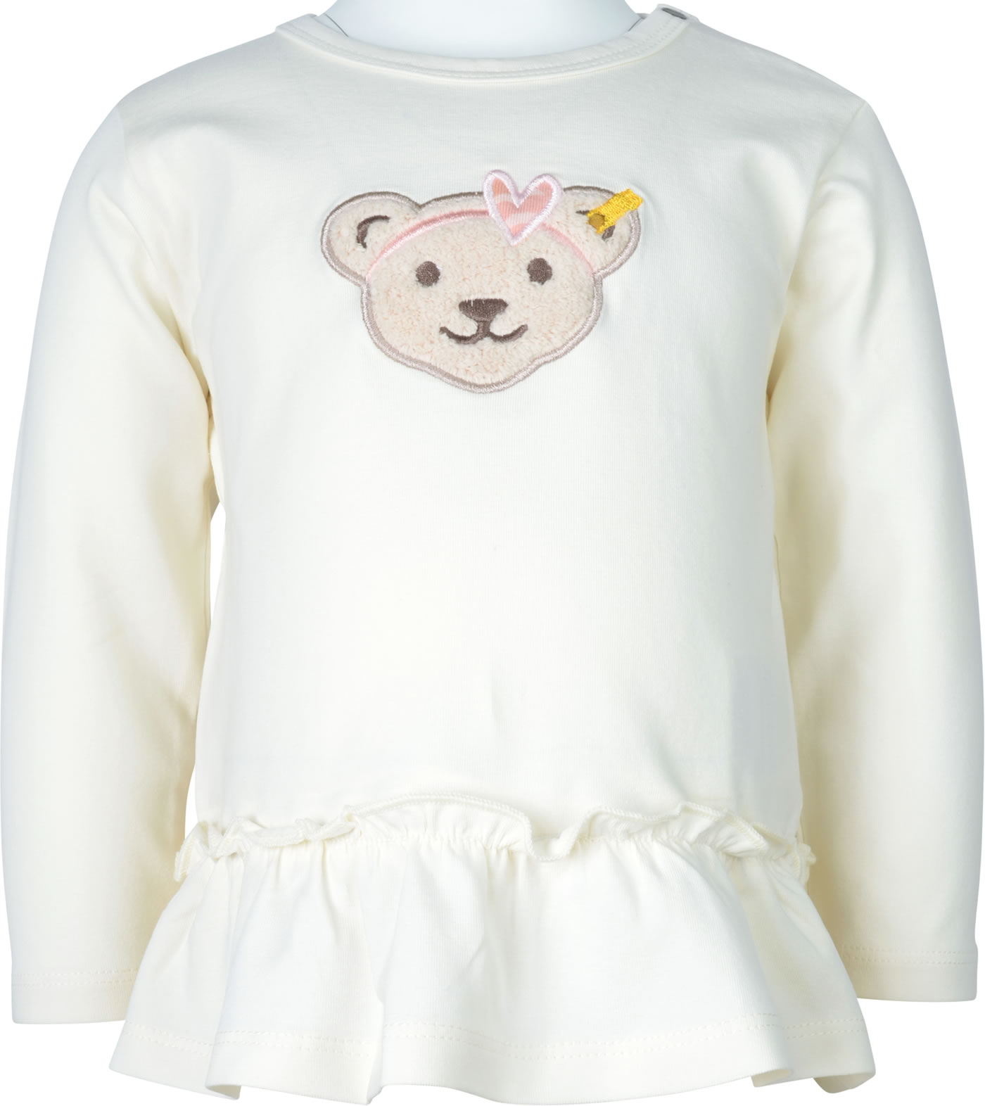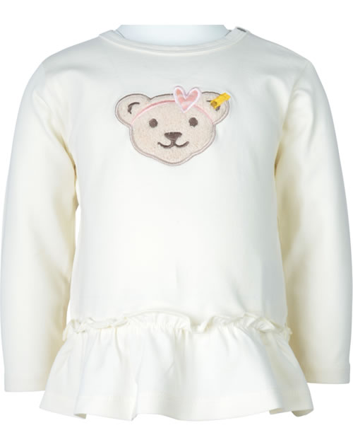 Langarmshirt aus weichem Jersey für Mädchen aus der Wild City Kollektion von STEIFF. Schöne Details sind der STEIFF Bär mit einem Herz-Haarband auf der Vorderseite und der gerüschte Volant. Druckknöpfe auf der Schulter helfen beim An- und Ausziehen.