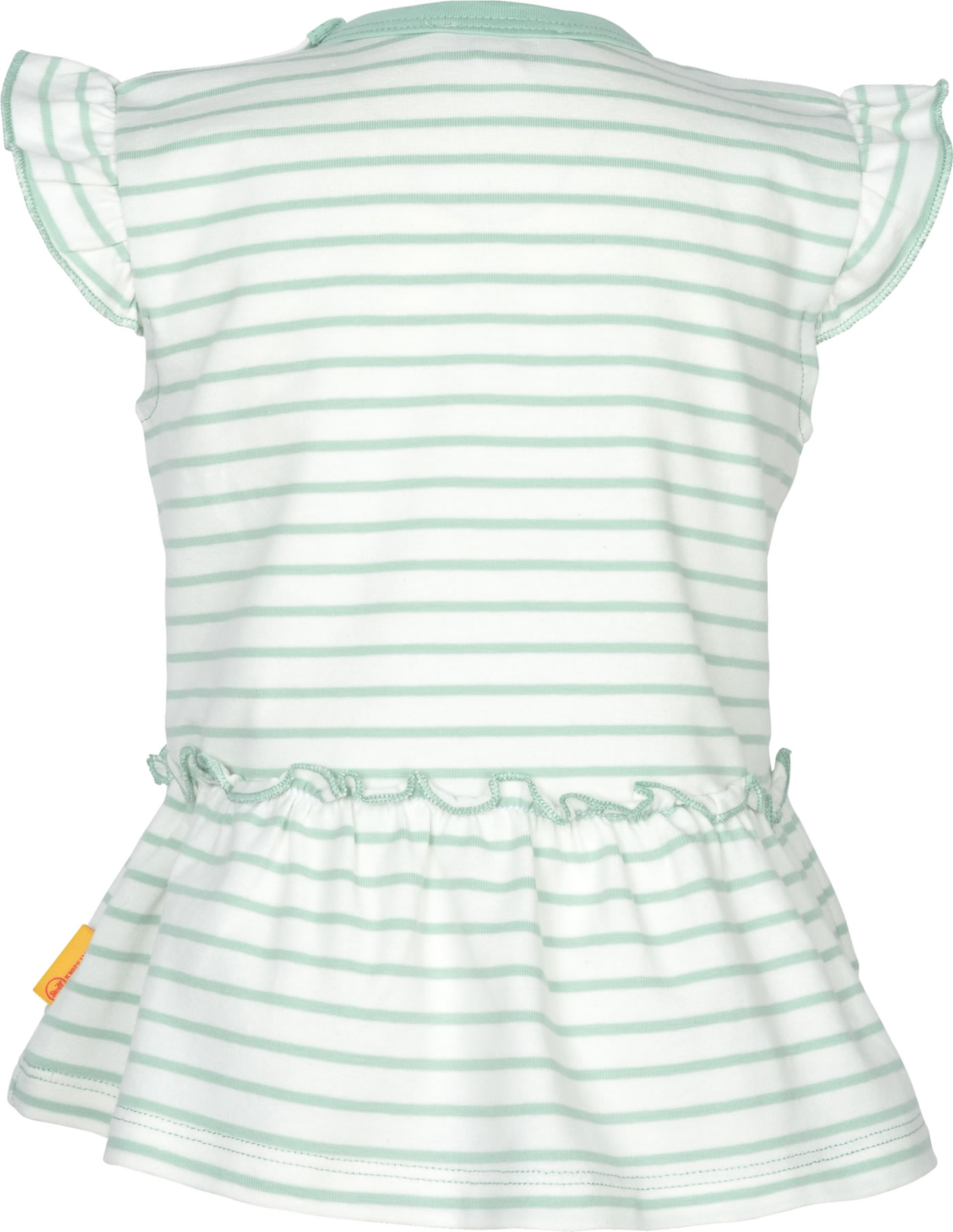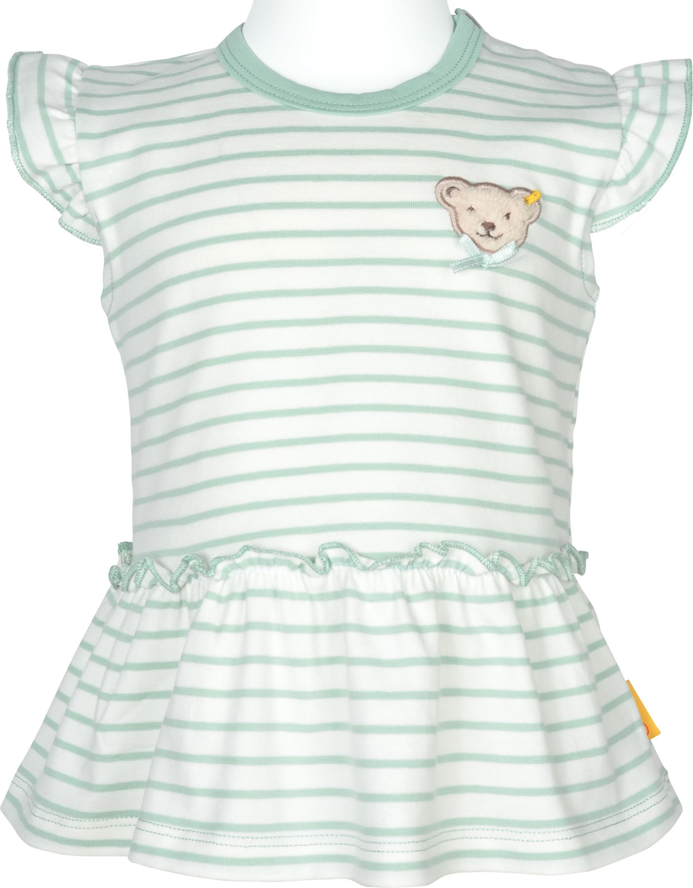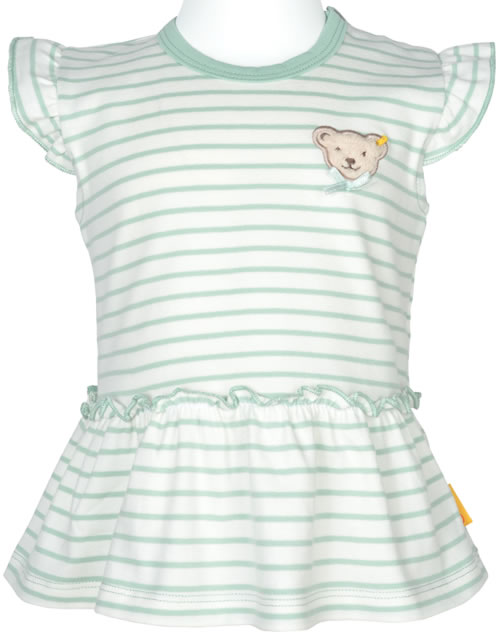 Tunika mit Flügelärmeln für Mädchen aus der Jungle Feeling-Kollektion von STEIFF. Die gestreifte Tunika ist aus weichem Material. Schöne Details sind das abgesetzte Röckchen und der STEIFF Bär, den eine Schleife ziert. Druckknöpfe auf der Schulter erleichtern das An- und Ausziehen.