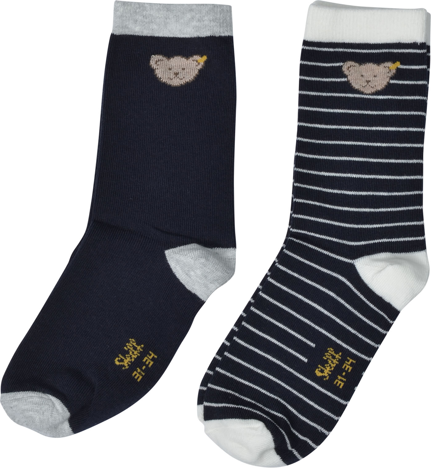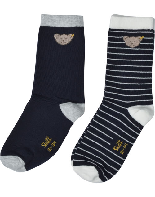 Zwei paar hübsche Socken mit Streifen oder uni von STEIFF. Der STEIFF-Bärenkopf ziert den Knöchel.