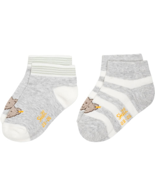 Zwei paar hübsche Socken mit Streifen oder uni von STEIFF. Der STEIFF-Bärenkopf ziert die Vorderseite.