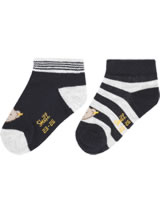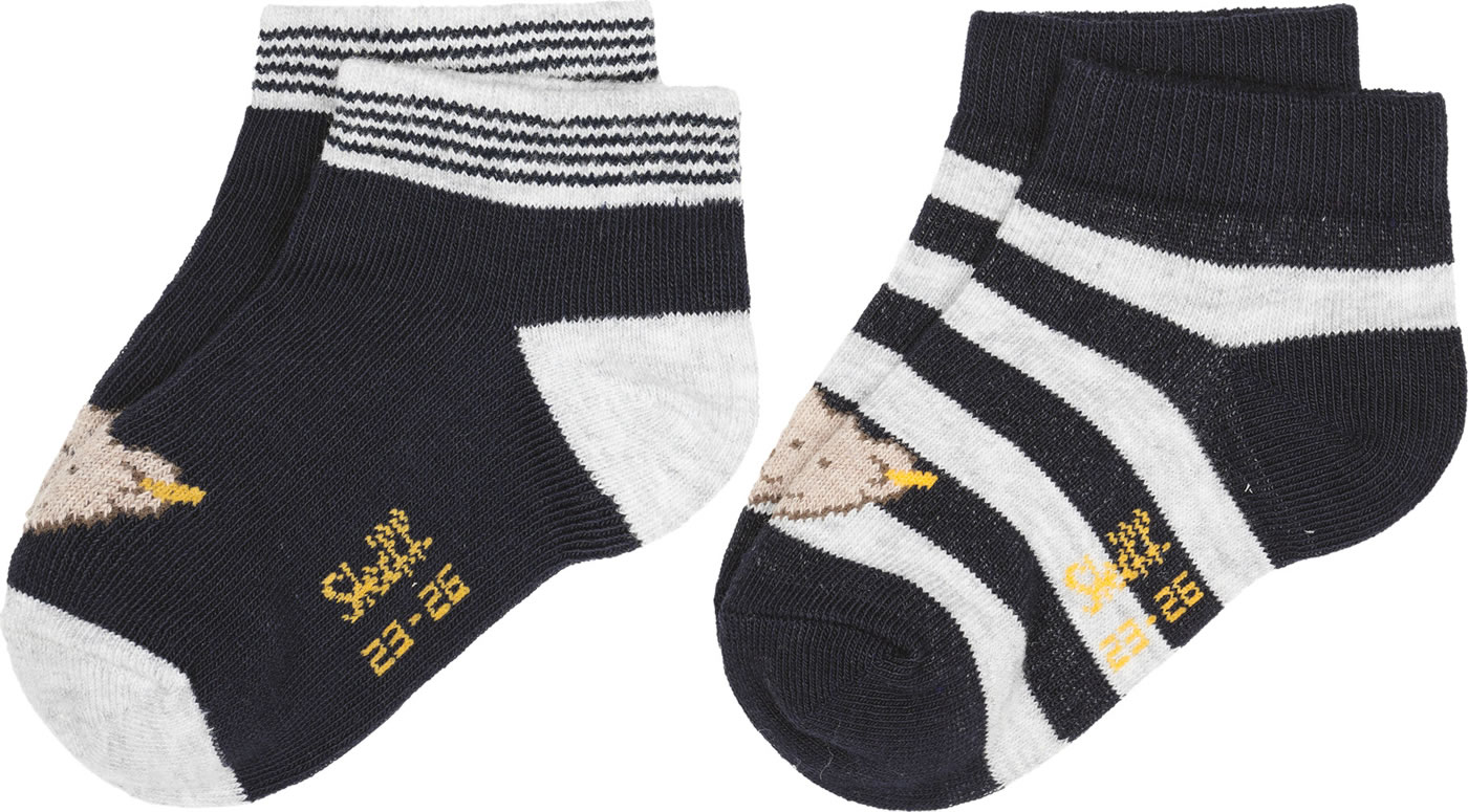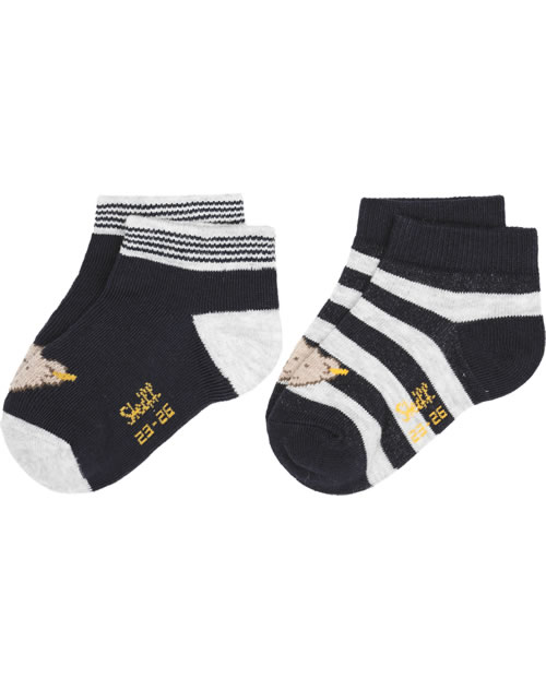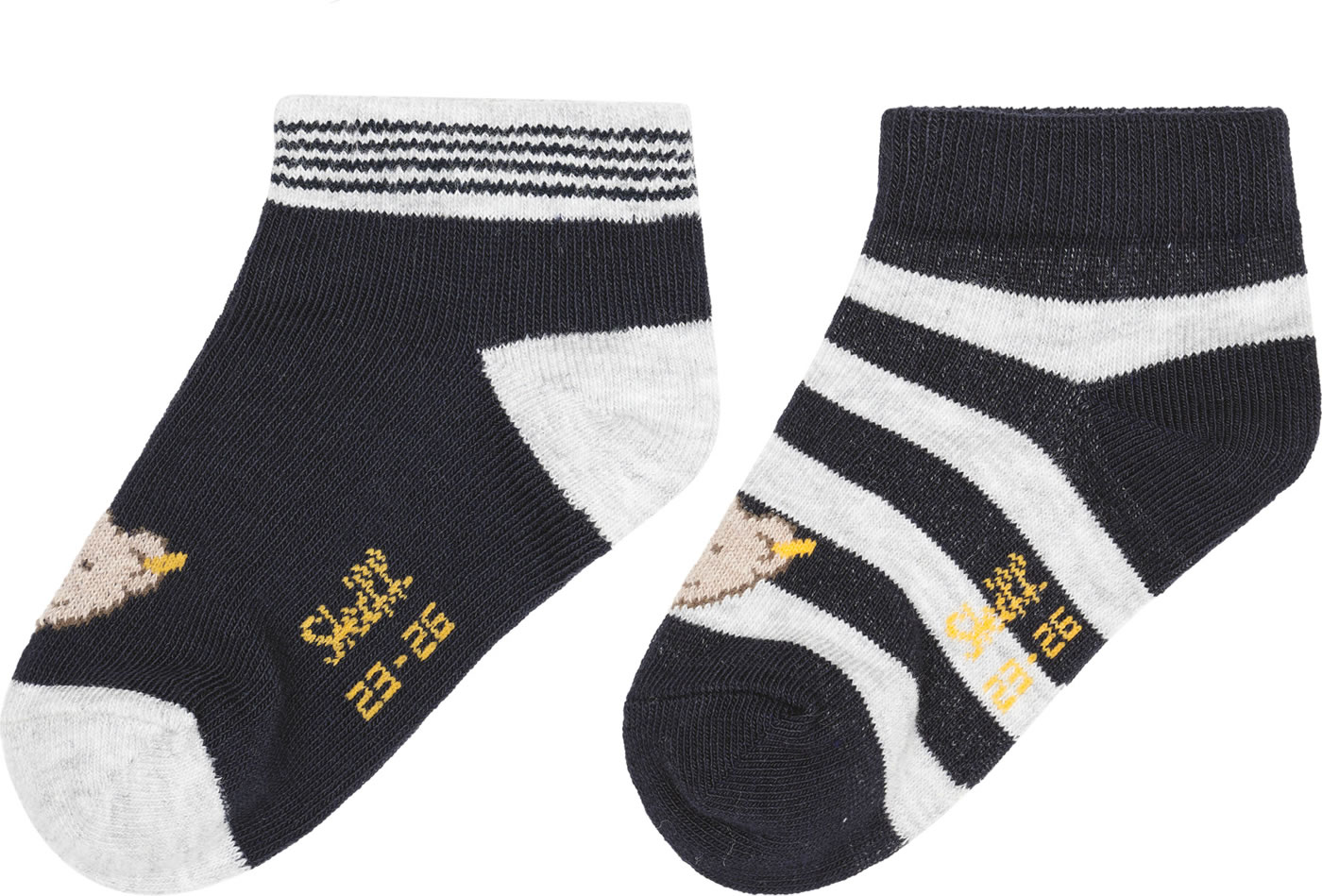 Zwei paar hübsche Socken mit Streifen oder uni von STEIFF. Der STEIFF-Bärenkopf ziert die Vorderseite.