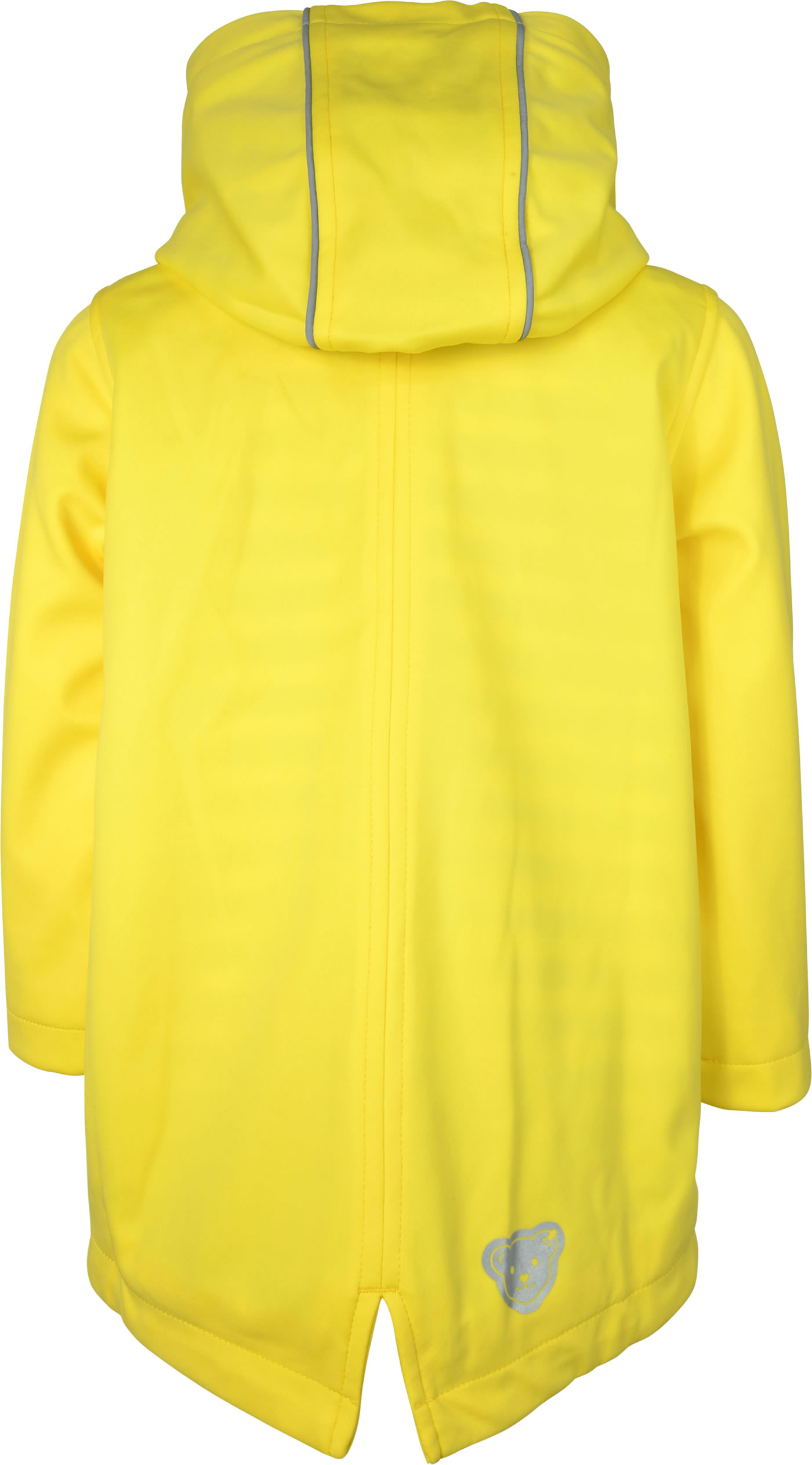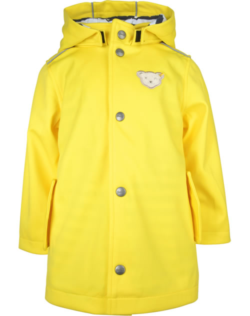 Mit diesem tollen knallgelben Softshell-Parka von STEIFF aus der Classic Collection machen kleine Regenschauer richtig Spaß. Der Parka kommt mit einer Kapuze und einem verlängerten Rücken mit Schlitz zum Schutz von außen während das weiche, gestreifte Baumwoll-Jersey-Futter den Träger innen herrlich warm hält. Die gefütterte Kapuze lässt sich kinderleicht abknöpfen. Die smarten Steiff Druckknöpfe lassen sich leicht schließen und es gibt praktische Klappen-Taschen für kleine Hände. Das STEIFF Teddybär-Motiv auf der Vorderseite fügt sich schön ein und der reflektierende Teddy auf der Rückseite ist ein praktisches Detail.