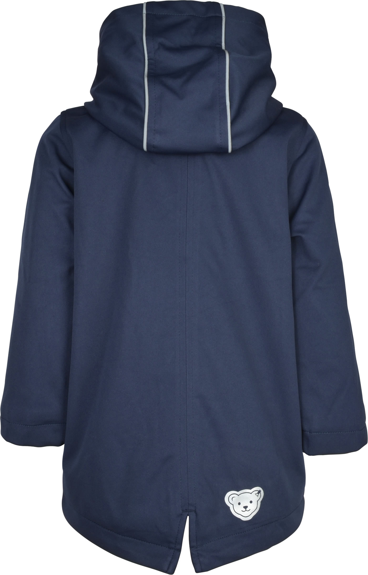 Mit diesem tollen marine-blauen Softshell-Parka von STEIFF aus der Classic Collection machen kleine Regenschauer richtig Spaß. Der Parka kommt mit einer Kapuze und einem verlängerten Rücken mit Schlitz zum Schutz von außen während das weiche, gestreifte Baumwoll-Jersey-Futter den Träger innen herrlich warm hält. Die gefütterte Kapuze lässt sich kinderleicht abknöpfen. Die smarten Steiff Druckknöpfe lassen sich leicht schließen und es gibt praktische Klappen-Taschen für kleine Hände. Das STEIFF Teddybär-Motiv auf der Vorderseite fügt sich schön ein und der reflektierende Teddy auf der Rückseite ist ein praktisches Detail.