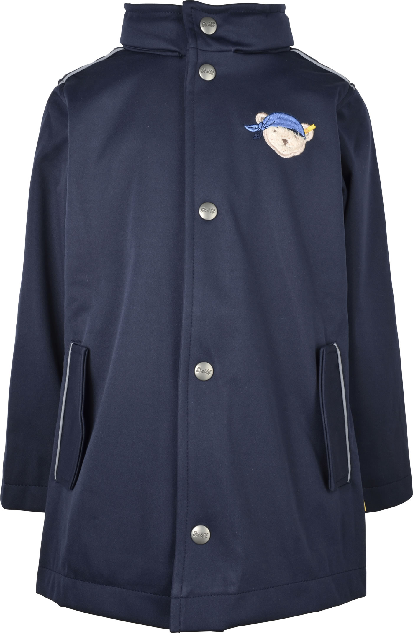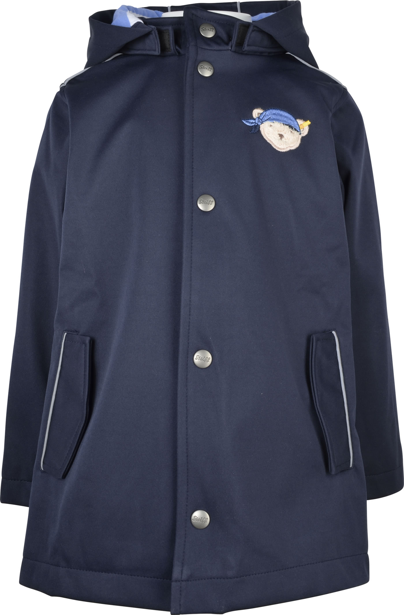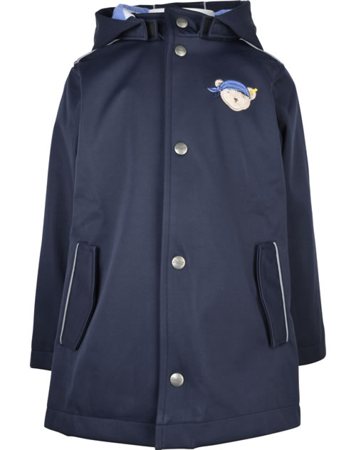 Softshell-Mantel mit abnehmbarer Kapuze aus der Under the Surface-Kollektion von STEIFF. Der Mantel bietet Schutz vor Kälte, Wind und Regen. Verschlossen wird der Mantel mit einer Druckknopfleiste. Der STEIFF Bär mit Piratenkopftuch ziert die Brust und befindet sich als reflektierendes Element auf der Rückseite. Gefüttert ist der Mantel mit weichem Baumwoll-Jersey. Die Rückseite ist etwas länger geschnitten.