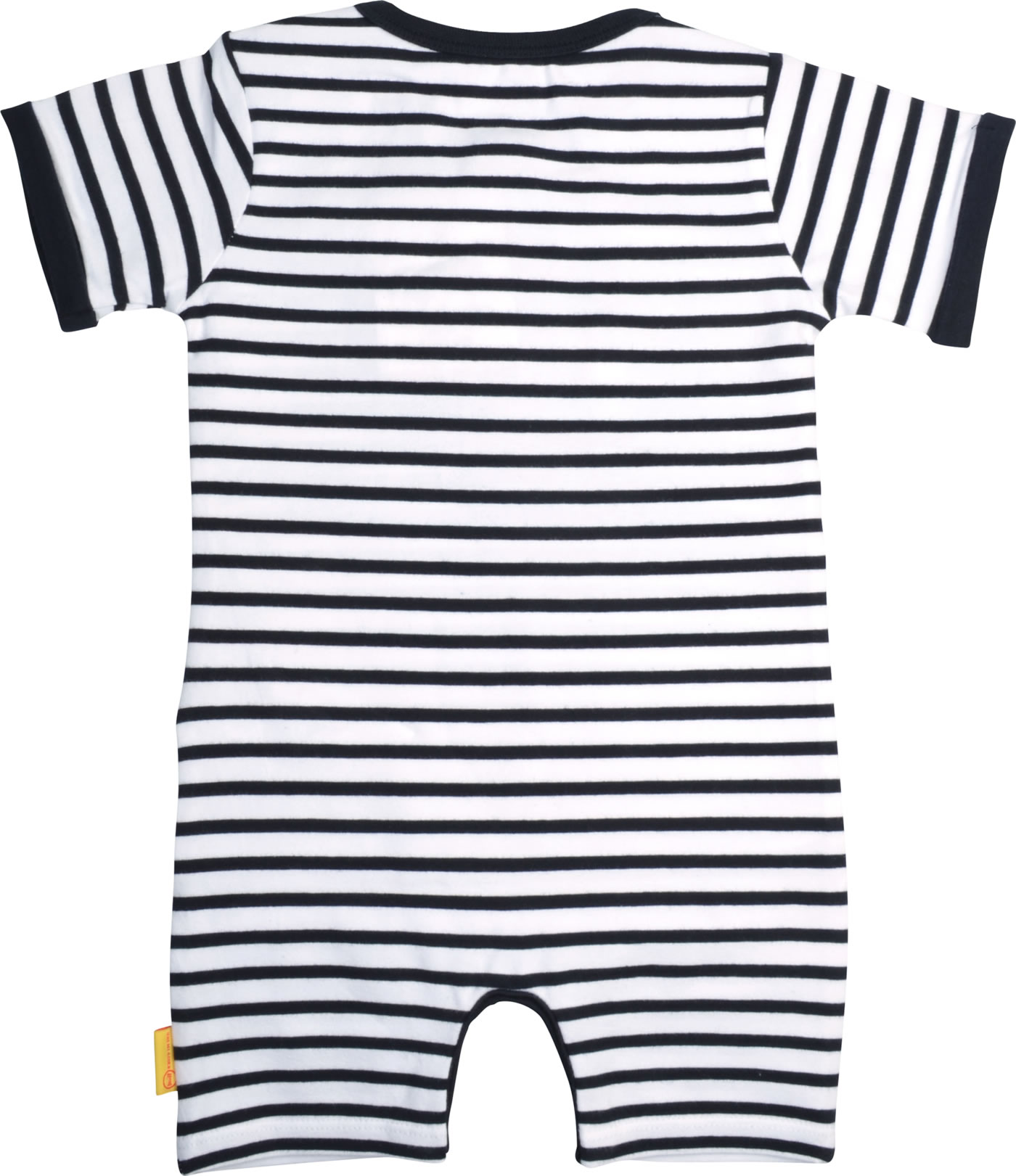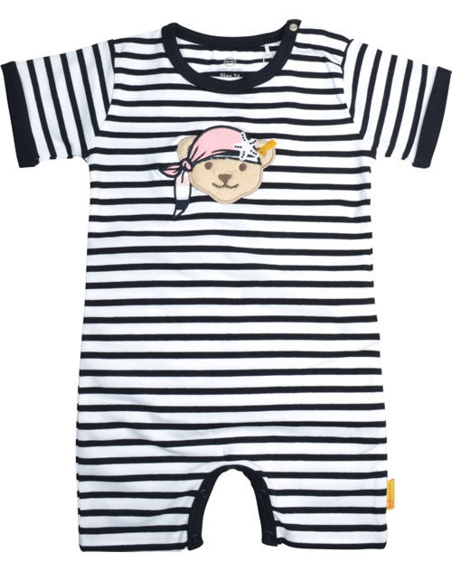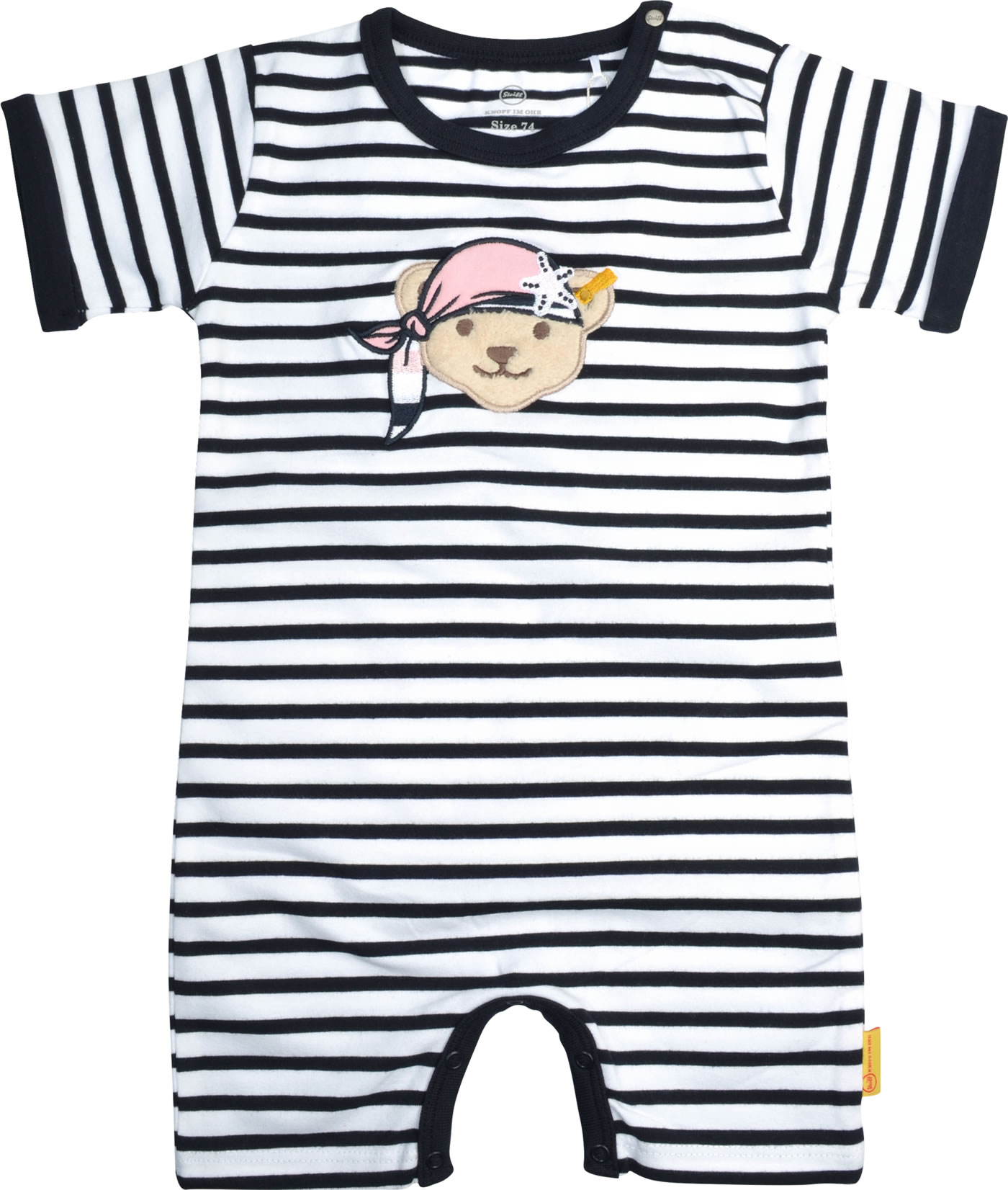 Kurzer Spielanzug für Mädchen aus der Beach Please-Kollektion von STEIFF. Der Strampler aus weichem Jersey wird mit Drucknöpfen auf der Schulter und im Schritt verschlossen. Besonders schöne Details sind das Streifenmuster und der große STEIFF Bär mit Piratenkopftuch auf der Brust.