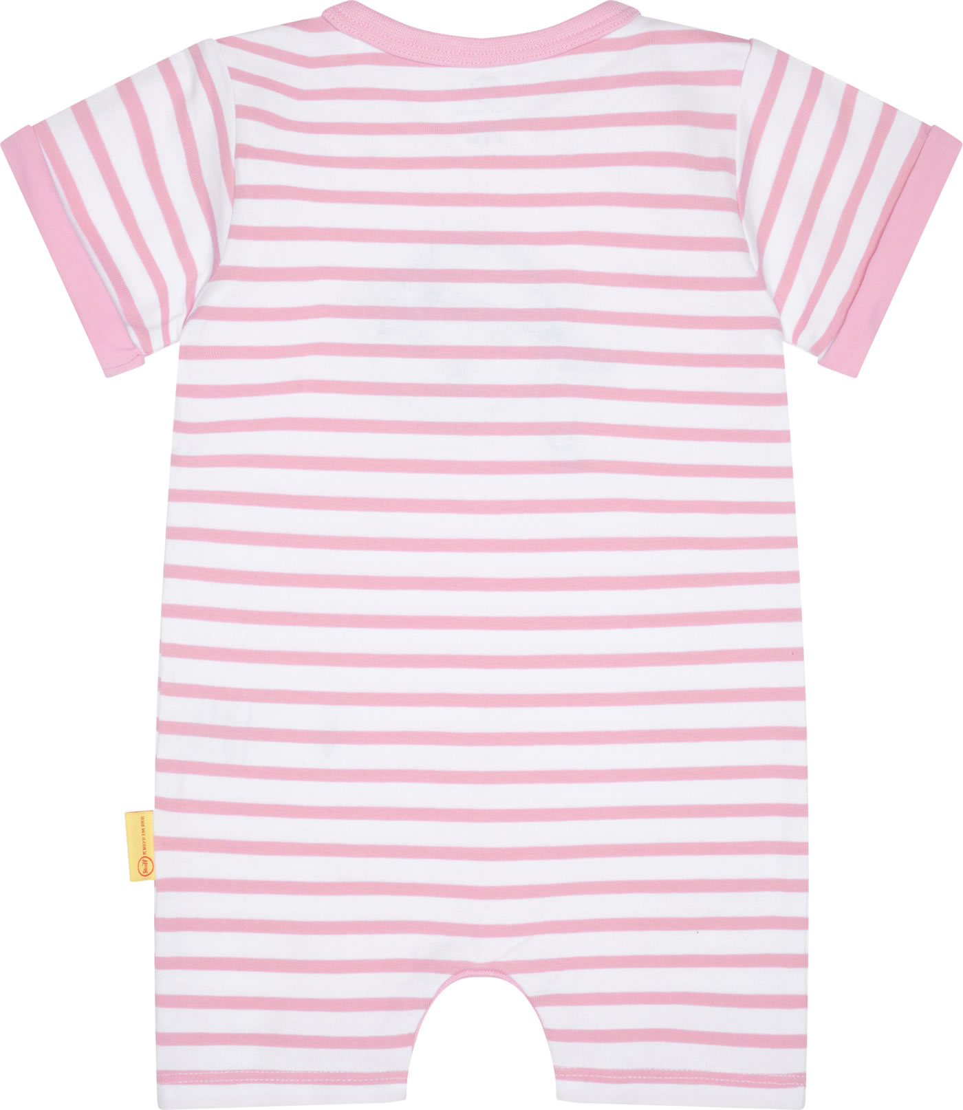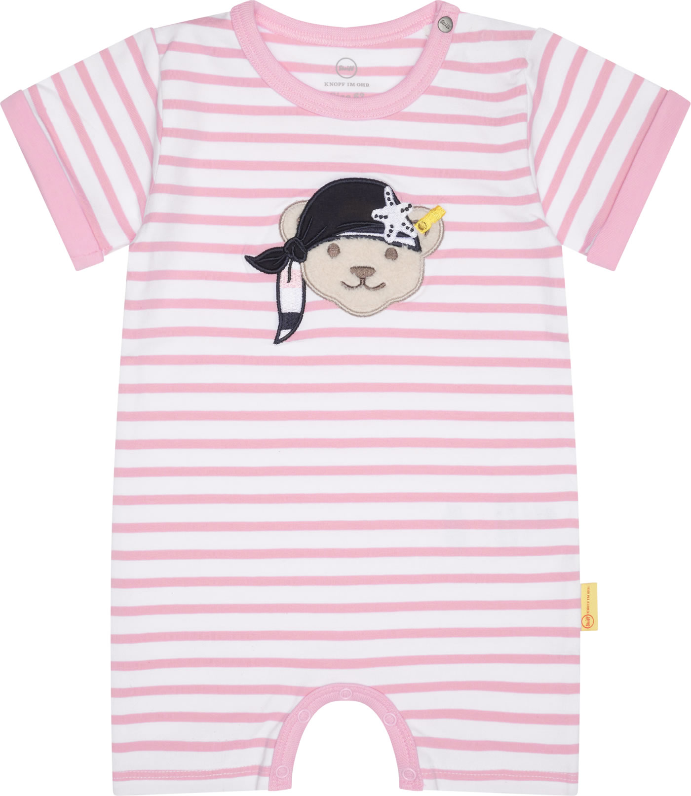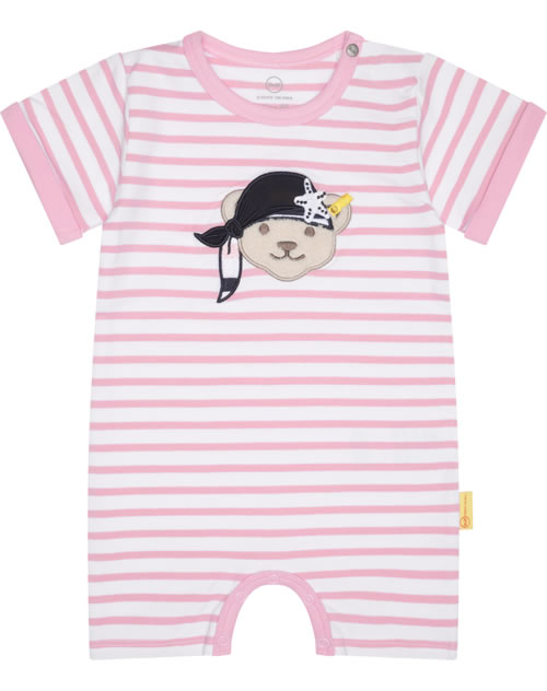 Kurzer Spielanzug für Mädchen aus der Beach Please-Kollektion von STEIFF. Der Strampler aus weichem Jersey wird mit Drucknöpfen auf der Schulter und im Schritt verschlossen. Besonders schöne Details sind das Streifenmuster und der große STEIFF Bär mit Piratenkopftuch auf der Brust.